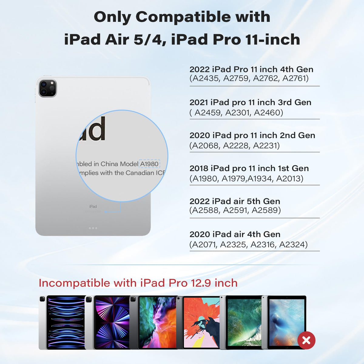 Q: Is the APPS2Car Magic Keyboard compatible with my iPad model?A: Yes, the APPS2Car Magic Keyboard is compatible with iPad Pro 11-inch (1st, 2nd, 3rd, 4th Gen) and iPad Air (4th, 5th Gen). Please check the model number on the back of your iPad, which starts with 'A', to ensure compatibility.