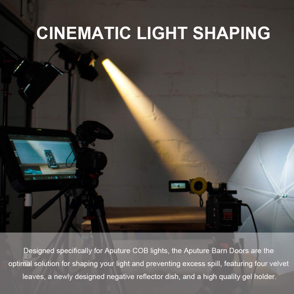 Aputure Barndoors For Aputure 120D Mark 2, Aputure 120D, Aputure 300D,Bowens Mount, 4-Leaf Velvet Fabric, Honeycomb & Magnetic Gel Holder The Aputure Barndoors Are The Optimal Solution For Shaping Your Cob Light And Preventing Light Spill. Designed Specifically For The 120 Series And 300D, The Aputure Barndoors Feature Four Velvet Leaves, A Newly Designed Negative Reflector Dish, And A High Quality Gel Holder. The Aputure Barndoors Are Made Of Four Leaves, Each With An Internal Black Velvet Fabric To Maximize Light Absorption, Allowing For Virtually No Light Leak. Though Maximum Light Control Will Be Achieved With The Included Black Reflector Dish, The 4 Leaves Can Be Mounted Onto The Standard Aputure Silver Reflector Dish Or The Aputure Fresnel As Well. The Barndoors Use A Snap-In Mounting Structure, Which Makes Installation And Disassembly Quick And Convenient. In Addition To Special Adapter Rings, They Can Also Be Fit On The Front Of A Standard 7 Inch Reflector, Fresnel And Other Compatible Accessories. What'S In Package 1X Bowens Mount Ring 1X Barn Door 1X Gel Holder 1X Honeycomb Grid Caution: When Using Color Gels With Powerful Led Lights, Such As The Aputure C300D, The Heat Will Cause The Filter Gels To Distort Or Burnt After A Period Of Time. You Are Advised To Change New Sheets Of Color Filters Once Every Three Hours During Constant Usage; You Are Recommended To Use Rosco Or Lee For Better Results.