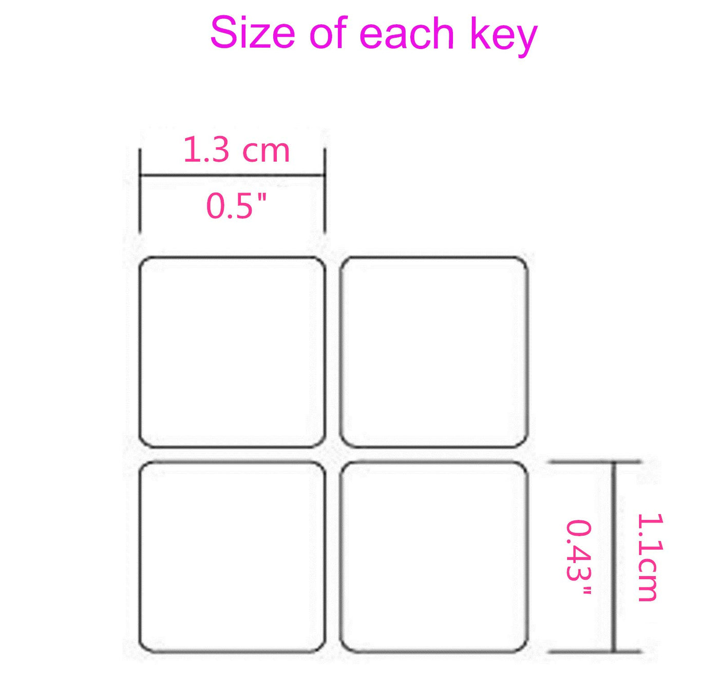 Q: What are the dimensions of each sticker?A: Each sticker measures 1.1 cm x 1.3 cm, making them compact enough to fit neatly on the keys of various keyboard types while still being easily readable.