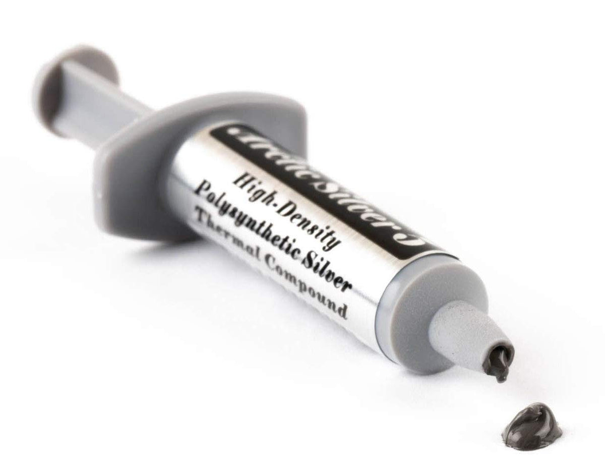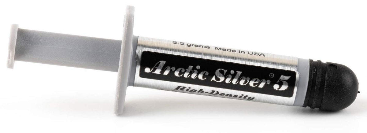 Arctic Silver 5 High-Density Polysynthetic Silver Thermal Compound 3.5G As5-3.5G Arctic Silver 5 Premium Thermal Compound, With 99.9% Pure Micronized Silver, Is Specifically Designed To Maximize The Thermal Conductivity Between Todays High-Powered Processors And High-Performance Cooling Assemblies. Arctic Silver 5 Uses Three Unique Shapes And Sizes Of Near-Pure Silver Particles To Maximize Particle-To-Particle Contact Area And Thermal Transfer. It Can Reduce Cpu Core Temperatures By Up To 50F Over Standard Silicone Thermal Pastes. Controlled Triple Phase Viscosity Allows Arctic Silver 5 To Fill, Over Time, Microscopic Valleys And Gaps In Cpu And Heatsink Surfaces. One 3.5G Tube Can Cover Up To 25 Cpu Cores. Made With 99.9% Pure Silver: Arctic Silver 5 Uses Three Unique Shapes And Sizes Of Pure Silver Particles To Maximize Particle-To-Particle Contact Area And Thermal Transfer. High-Density: Arctic Silver 5 Contains Over 88% Thermally Conductive Filler By Weight. In Addition To Micronized Silver, Arctic Silver 5 Also Contains Sub-Micron Zinc Oxide, Aluminum Oxide And Boron Nitride Particles. These Thermally-Enhanced Ceramic Particles Improve The Compounds Performance And Long-Term Stability Controlled Triple-Phase Viscosity: Arctic Silver 5 Does Not Contain Any Silicone. The Suspension Fluid Is A Proprietary Mixture Of Advanced Polysynthetic Oils That Work Together To Provide Three Distinctive Functional Phases. As It Comes From The Syringe, Arctic Silver 5S Consistency Is Engineered For Easy Application. During The Cpus Initial Use, The Compound Thins Out To Enhance The Filling Of The Microscopic Valleys And Ensure The Best Physical Contact Between The Heatsink And The Cpu Core. Then The Compound Thickens Slightly Over The Next 50 To 200 Hours Of Use To Its Final Consistency Designed For Long-Term Stability.