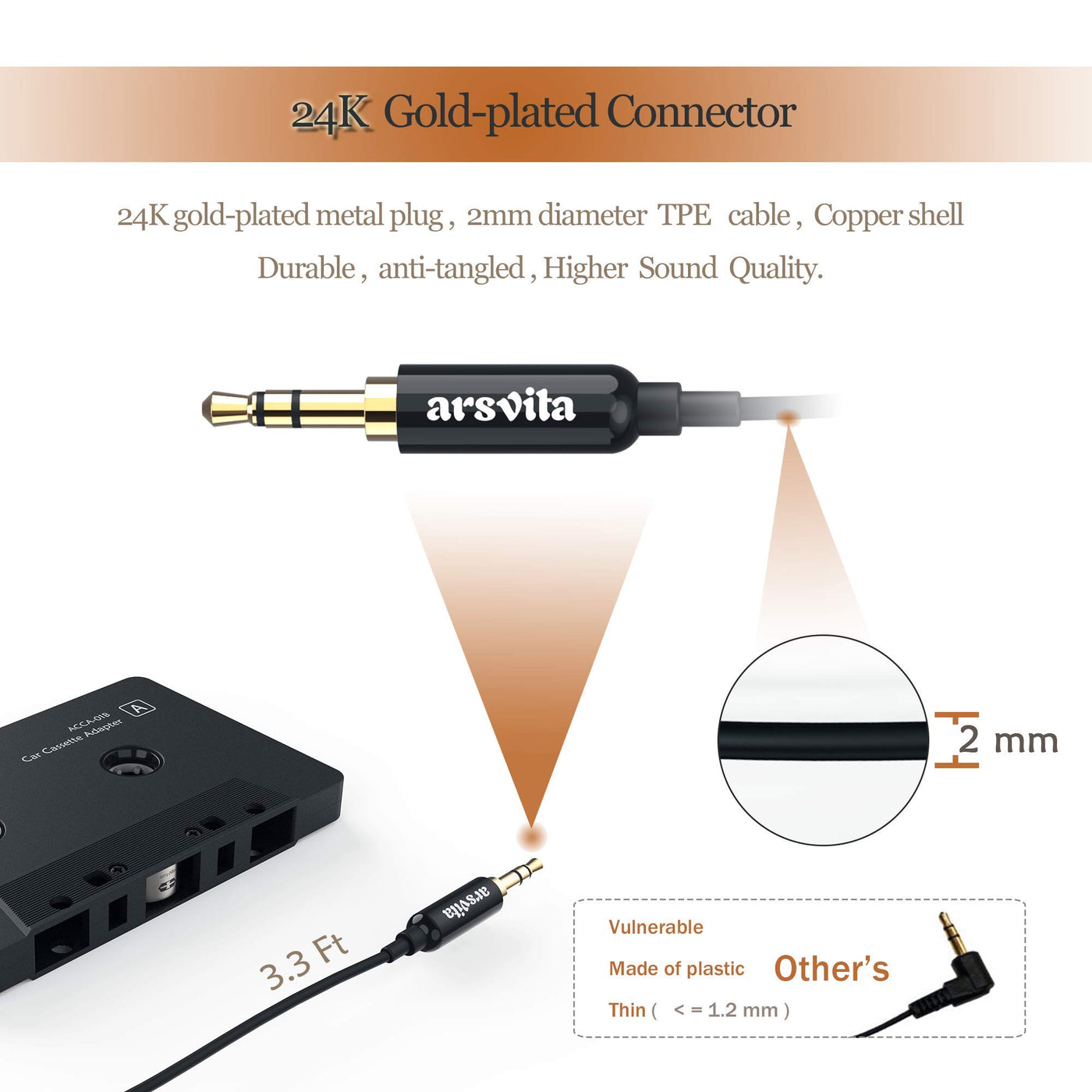 Arsvita Car Audio Cassette To Aux Adapter, 3.5 Mm Auxillary Cable Tape Adapter