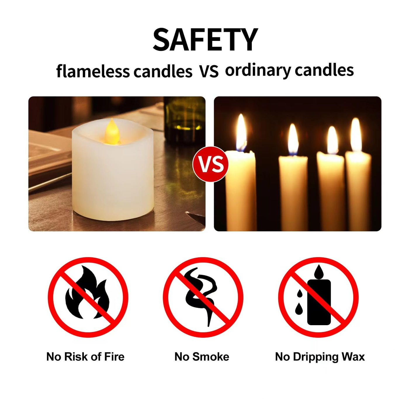 Q: What features make these candles safe to use?A: The flameless design eliminates the risk of fire, making the ASLDOIWEH candles a safe option for homes with children and pets. They also have a remote control feature to operate them from a distance.