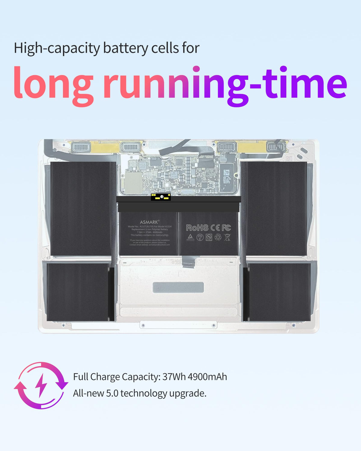 Q: What is the capacity and voltage of the ASMARK battery?A: This battery has a full charge capacity of 4900mAh and a voltage of 7.56V, ensuring reliable performance for your MacBook.