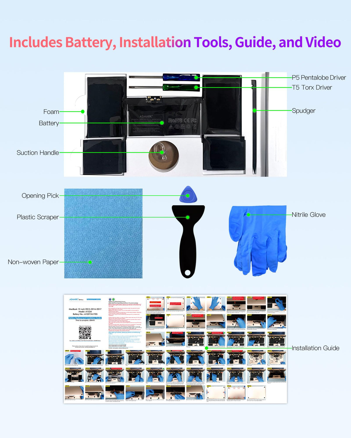 Q: What MacBook models are compatible with the ASMARK Battery Replacement?A: The ASMARK Battery Replacement is compatible with MacBook models A1534 from Early 2015, Early 2016, and Mid 2017, including specific configurations such as Core M, Core i5, and Core i7 variants.