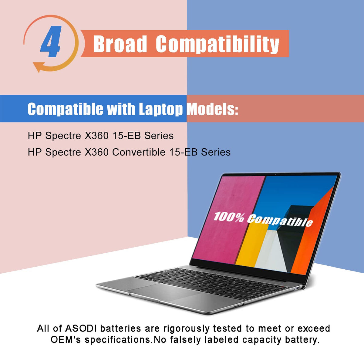 Q: Is the ASODI BN06XL laptop battery compatible with my HP Spectre X360 model?A: Yes, the ASODI BN06XL battery is compatible with various models of the HP Spectre X360 series, including 15-EB0005UR, 15-EB0025TX, and many others. To ensure compatibility, please check your original battery's part number before purchasing.