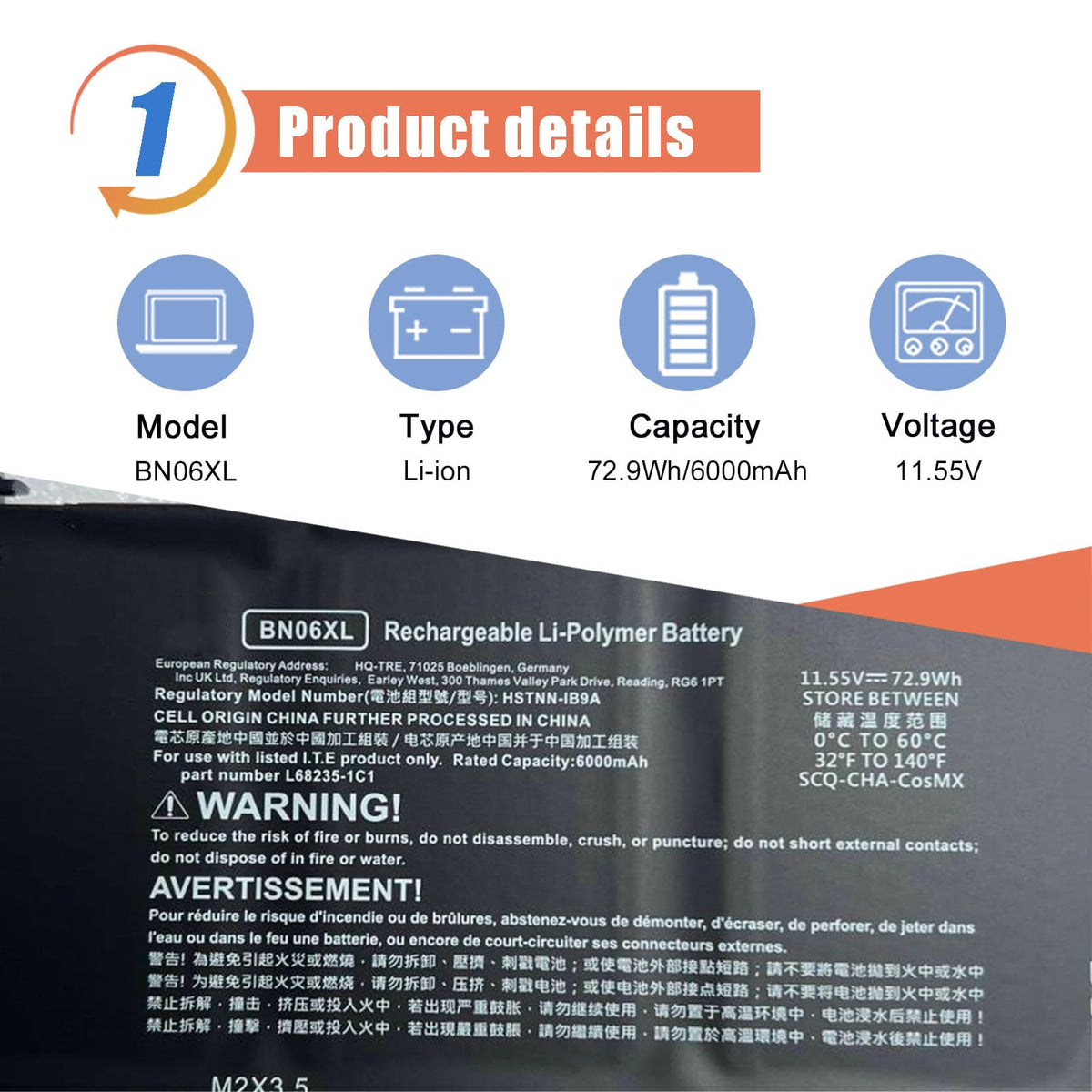 Welcome To Asodi ! We Focus On Our Batteries High-Quality And Pay More Attention To After-Sales Service All The Time. You Can Use It Safely. At The Same Time We Have Concentrated On The Laptop Batteries Production Manufacturing Work. We Promise That Our Batteries Are Selt Directly From The Factory To The Customers.Please Rest Assured To Buy! Note:If The New Battery Is Not Recognized During The Initial Installation, Please Reinstall And Check If The Interface Is Fully Connected.Discharge The New Battery To 5% (Not 0%), Then Charge And Cycle 3-4 Times To Wake Up The New Battery. Specifications: .Battery Type: Rechargeable Li-Ion Battery .Model: Bn06Xl .Voltage: 11.55V .Capatity: 72.9Wh/6000Mah .Compatible Models (Use ''Ctrl+F To Find Your Model Quickly'') For Hp Spectre X360 15 15-Eb Series 15-Eb0005Ur 15-Eb0025Tx 15-Eb0035Tx 15-Eb0053Tx 15-Eb0083Nr 15-Eb0250Nd 15-Eb0379Ng 15-Eb0520Na 15-Eb0675Ng 15-Eb0917Nz 15-Eb0927Nz 15-Eb0998Nz Forhp Spectre X360 Convertible 15-Eb0005Ni 15-Eb0009Ur 15-Eb0037Na 15-Eb1770Nd .Compatible Part Numbers: Bn06Xl Bn06072Xl Hstnn-Ib9A L68235-1C1 L68299-005 .Package Included: 1X Bn06Xl Battery 1X Instruction Manual .For Optimal Use Battery: Discharge The New Battery To 5% (Not 0%), Then Charge And Cycle 3-4 Times To Get The New Battery A Full Capacity. The Important Point Is To Perform A Full Discharge Charge Every Other Month To Extend Battery Life. Don'T Connect Adapter For A Long Time While Using The Battery. It May Damage The Battery. Avoid Artificial Shocks, Disassembly, Crush Or Puncture. Do Not Dispose Of In Fire Or Water. Avoid Using The Battery In An Environment Where The Temperature Is Too High Or Too Low.