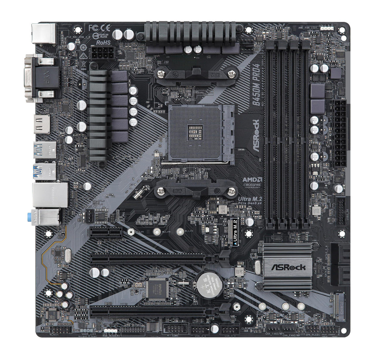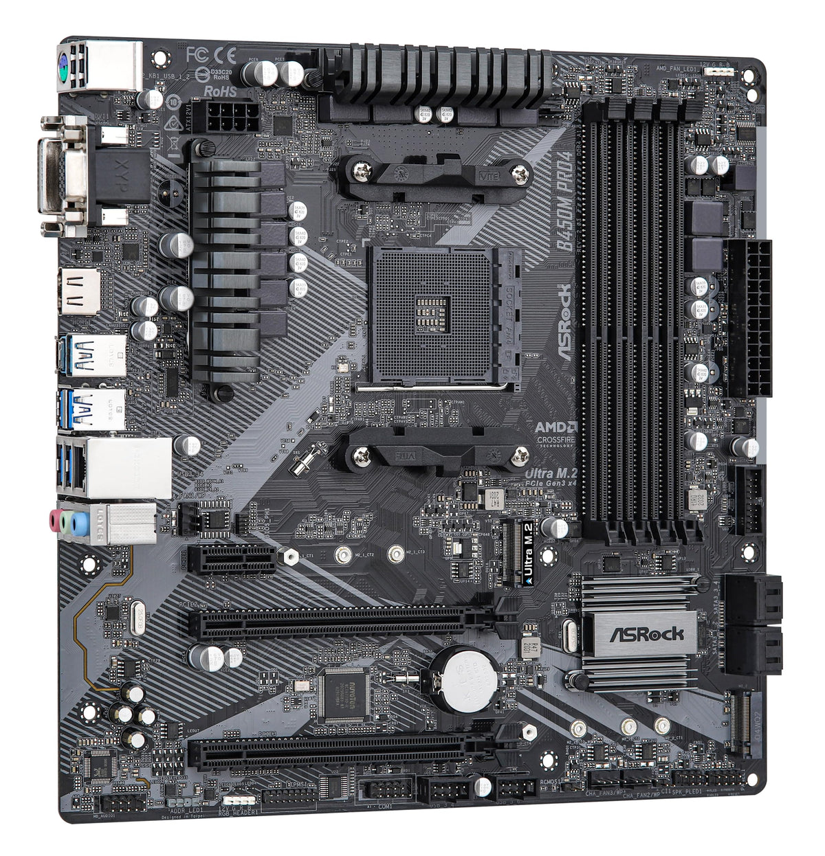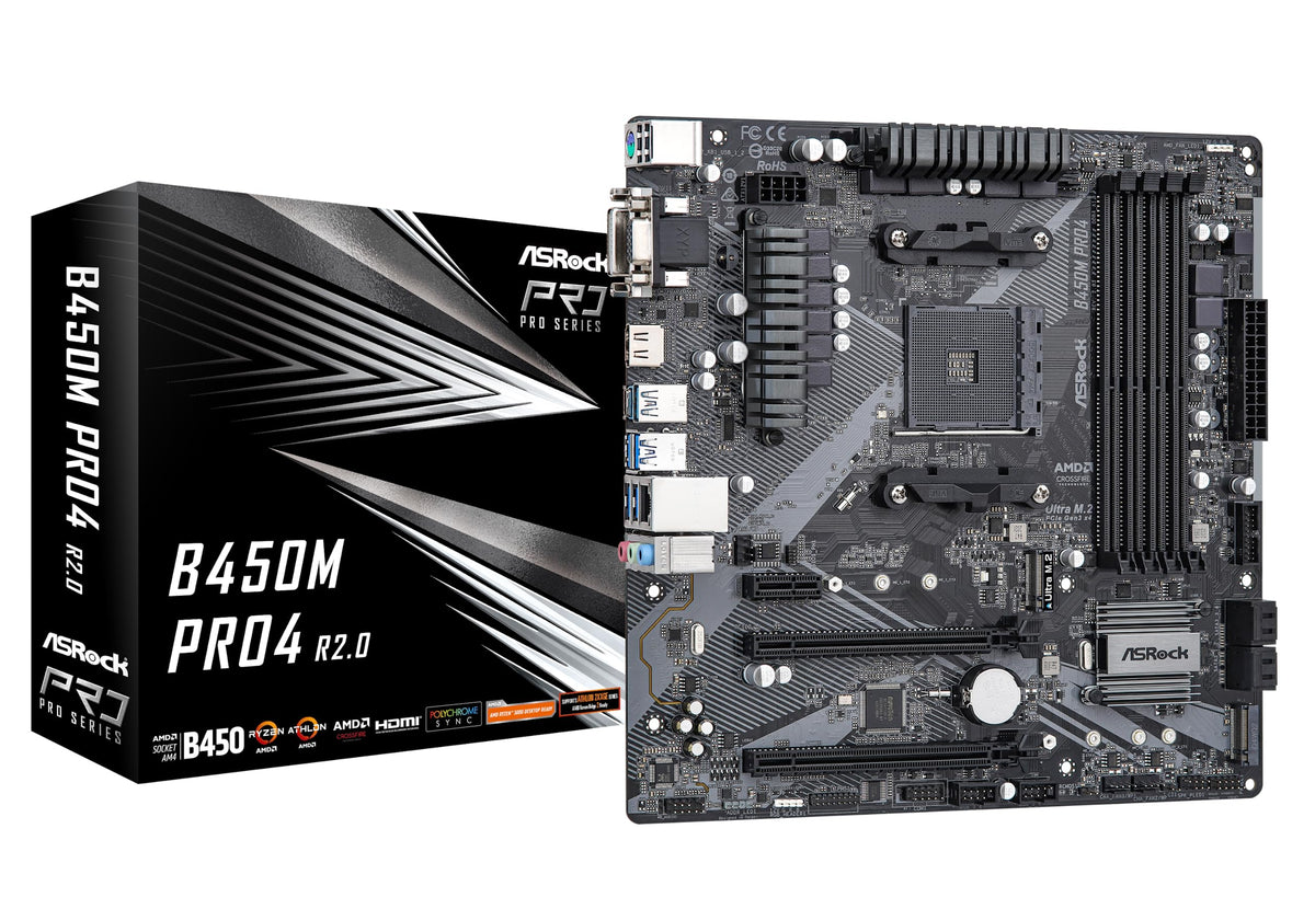Mfr Part Number:B450M Pro4 R2.0 Unique Feature: Asrock Usb 3.2 Gen2 - Asrock Usb 3.2 Gen2 Type-A Port (10 Gb/S) - Asrock Usb 3.2 Gen2 Type-C Port (10 Gb/S) Asrock Super Alloy - Premium 42A Power Choke - Sapphire Black Pcb - High Density Glass Fabric Pcb - 2Oz Copper Pcb Asrock Ultra M.2 (Pcie Gen3 X4) Asrock Full Spike Protection (For All Usb, Audio, Lan Ports) Asrock Live Update & App Shop Cpu: Supports Amd Am4 Socket Ryzen 2000, 3000 And 5000 Series Desktop Processors Digi Power Design 10 Power Phase Design Chipset:Amd Promontory B450
