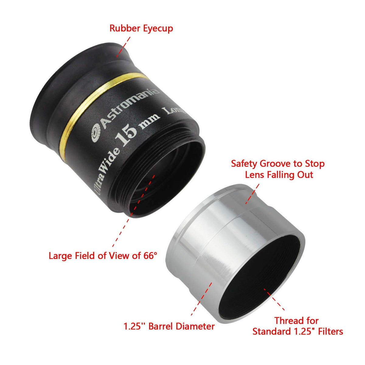 Q: What is the apparent field of view of the Astromania 1.25" 15mm eyepiece?A: The Astromania 1.25" 15mm eyepiece offers a generous 66-degree apparent field of view, allowing you to observe more of the night sky at once.