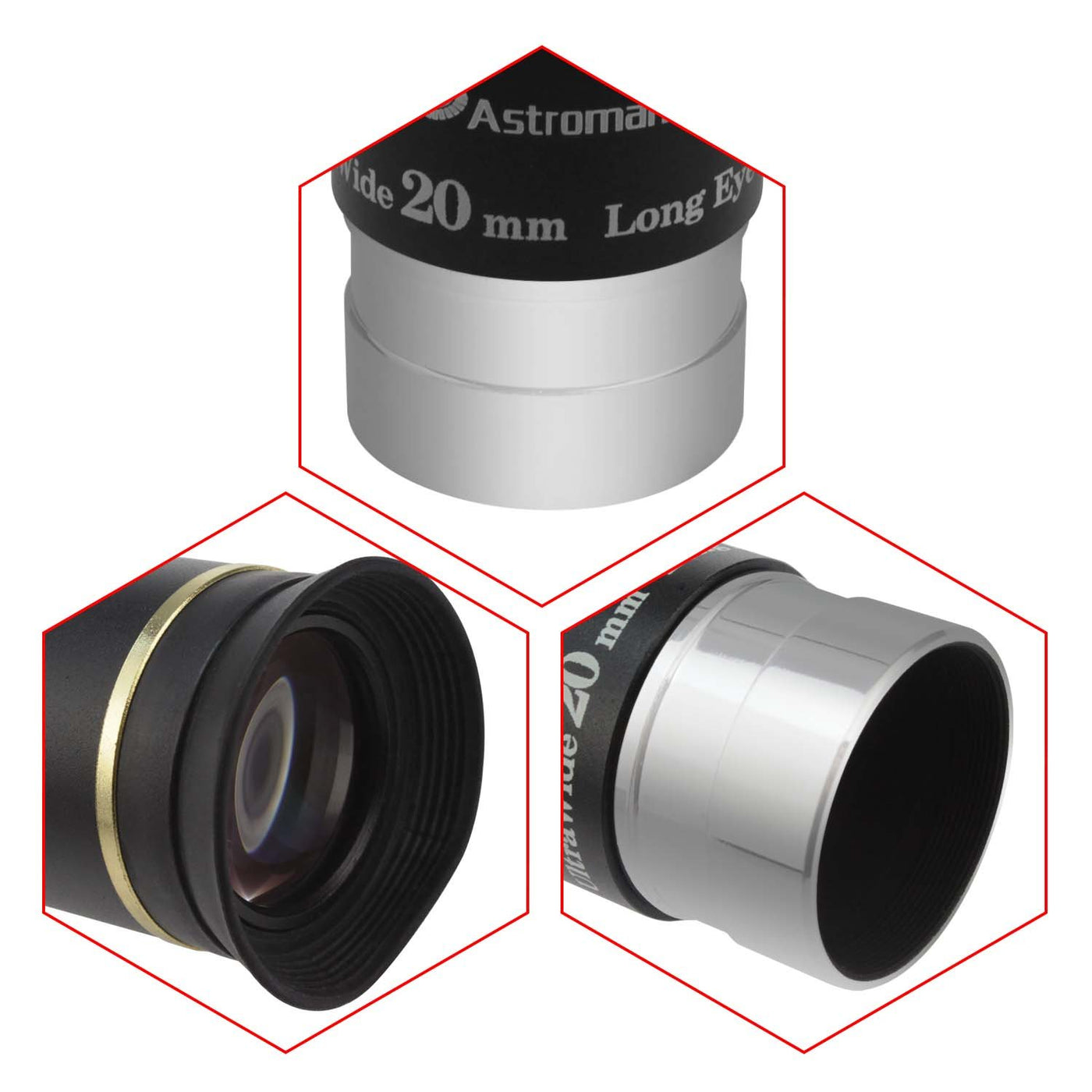 Q: What is the field of view provided by the Astromania 1.25" 20mm eyepiece?A: The Astromania 1.25" 20mm eyepiece offers a generous 66-degree apparent field of view, allowing you to observe more of the night sky at once, which is ideal for viewing celestial objects like the moon and star clusters.