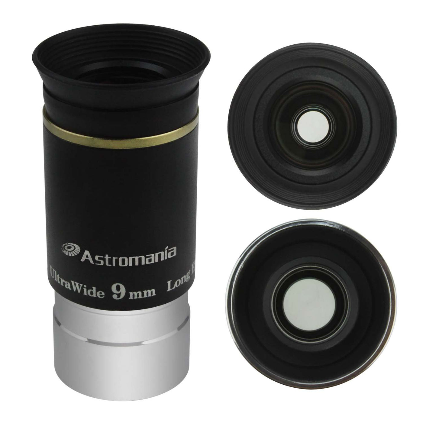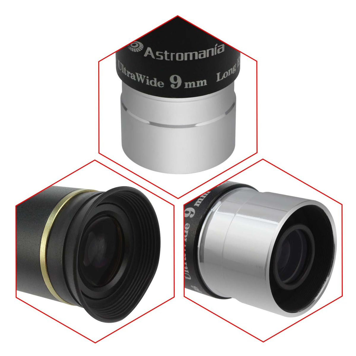 Q: What type of optics does the Astromania eyepiece use?A: The Astromania 9mm eyepiece features advanced 6-element HD optics with multi-coating, which enhances light transmission and provides clearer, sharper images with improved color correction and contrast.