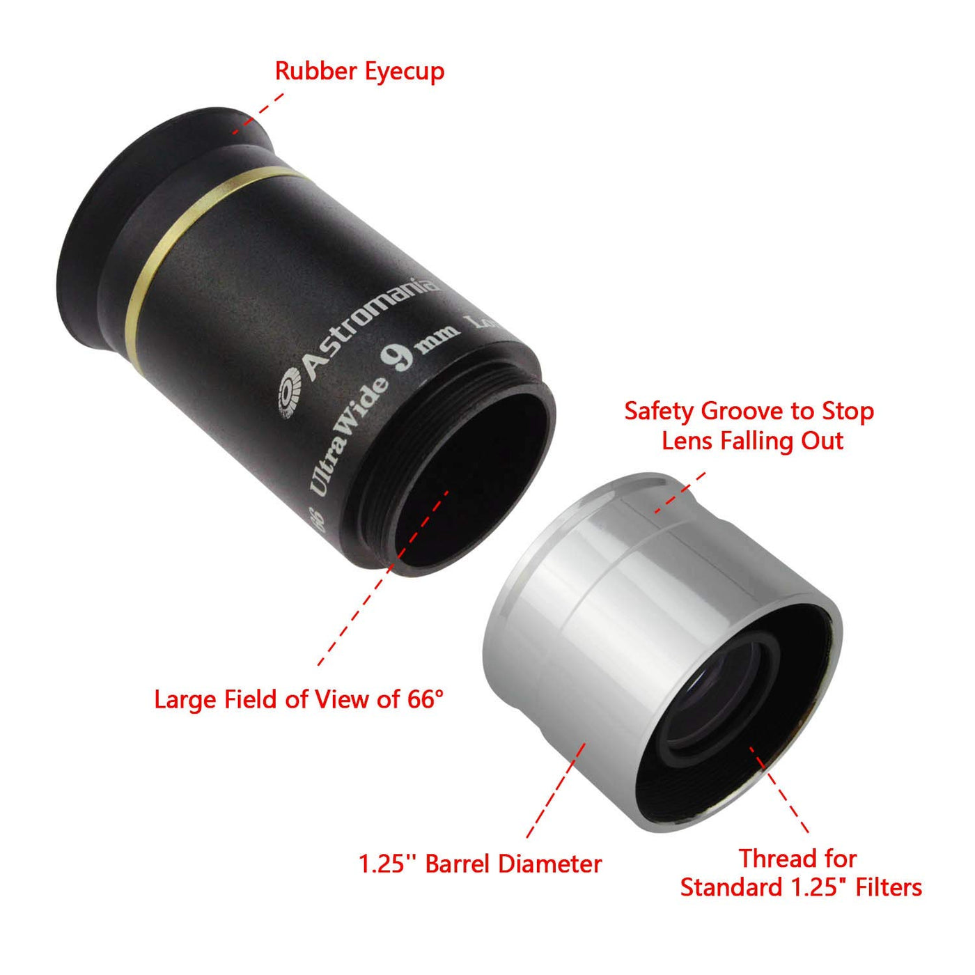 This High Quality Eyepiece Features A 5-Element Design That Offers Superior Sharpness. All Air To Glass Surfaces Have A Multi-Layer Coating (So These Are Fully Multi-Coated, Even Though The Barrel Imprint May Say ''Multi Coated'') For Maximum Light Transmission. The Long Eye Relief Allows For A Comfortable Viewing Distance. All Lens Edges Are Blackened For Superior Contrast. The Insert Tube Is Smooth-Sided And Is Threaded For Standard 1.25'' Astronomy Filters. Ultra Wide Lens Eyepieces Offer A Generous 66- Degree Apparent Field Of View, Allowing More Sky To Be Viewed At One Time. They Provide Sharp Image Right Across The Field. The Rubber Eyecups Are Included For Viewing Comfort And To Keep Out Extraneous Light.