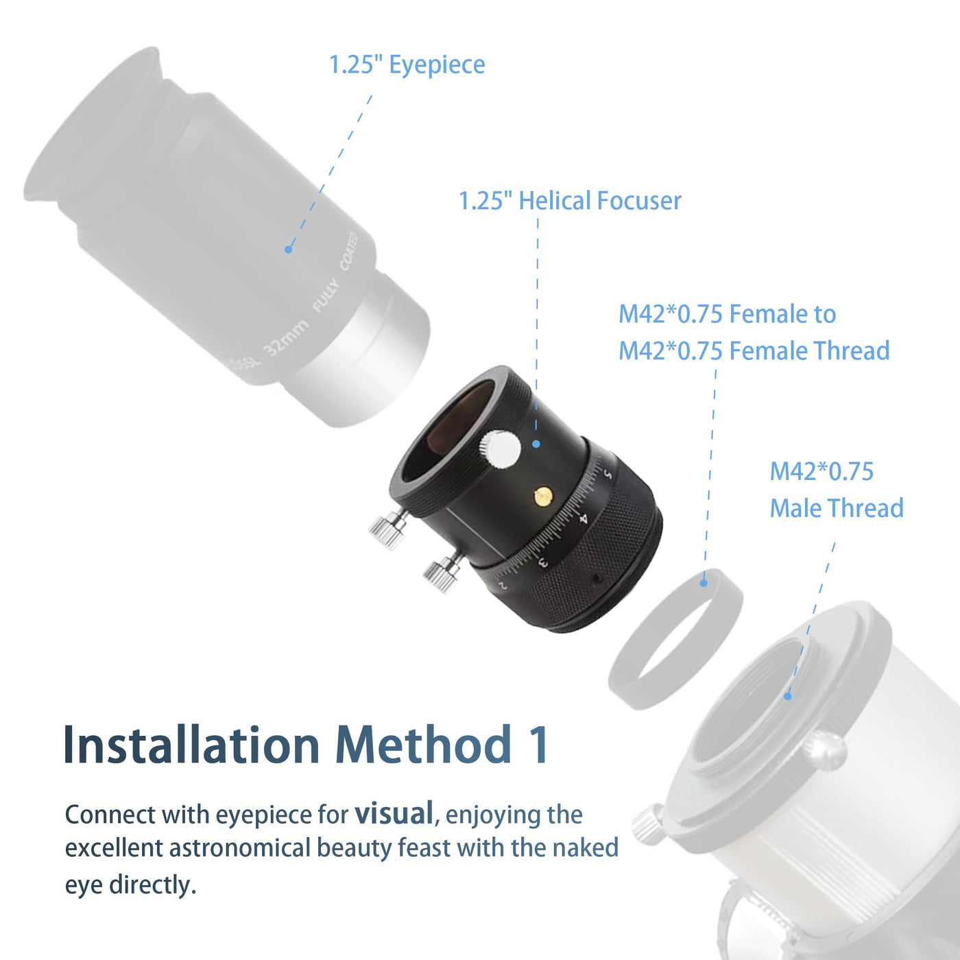 High Precision Double Helical Focuser For Guider Scope / Finder Scope Interface The Solution For Telescopes Or Telephoto Lenses With Sluggish Focusing Item Was Made By Full Metal, Durable Accuracy 0.05Mm Interface: 1.25 Inch With M42X0.75 Male Thread Primary Mirror Interfaces: M31X0.5 Focusing Stroke: 10Mm Minimum Length: 46Mm Longest Length: 56Mm