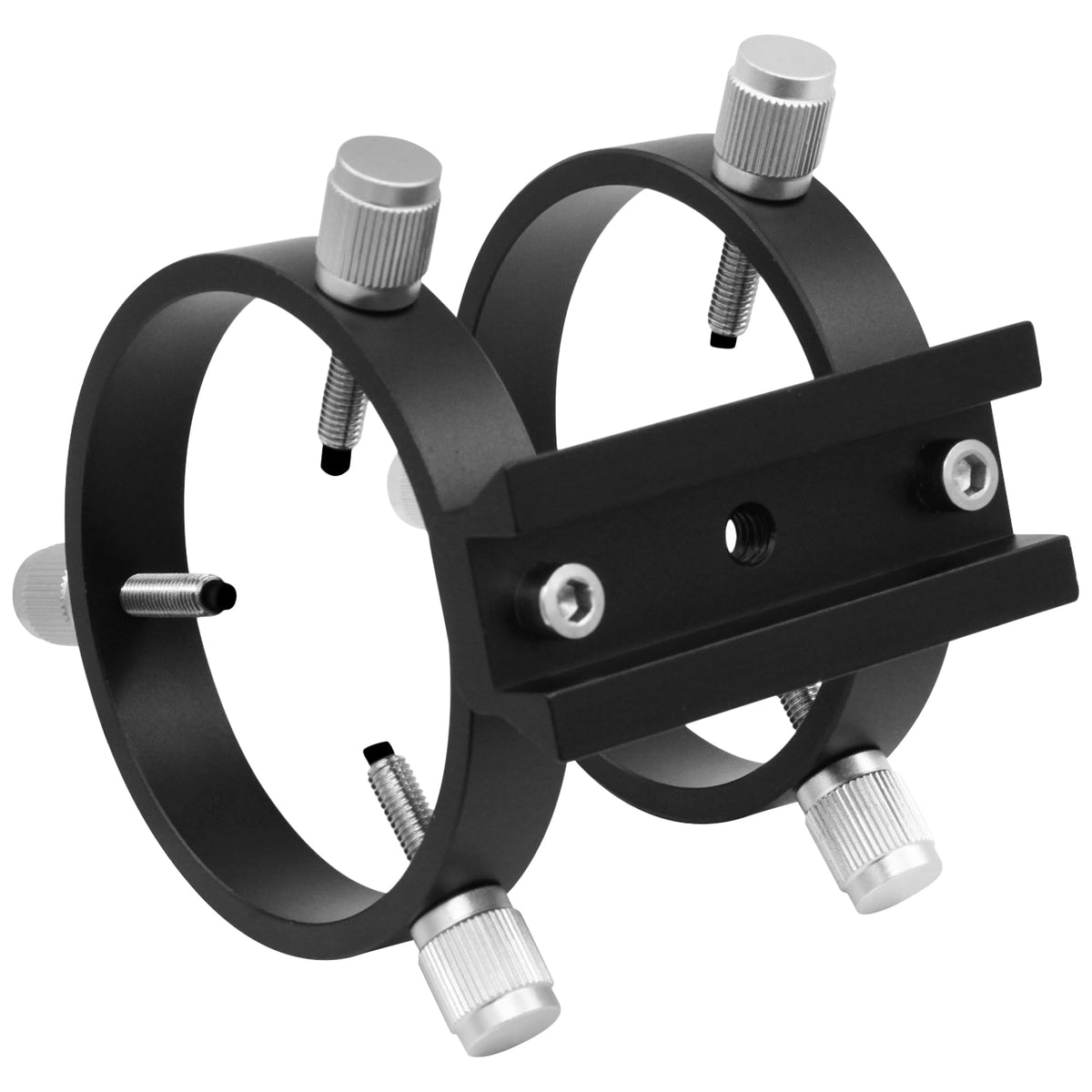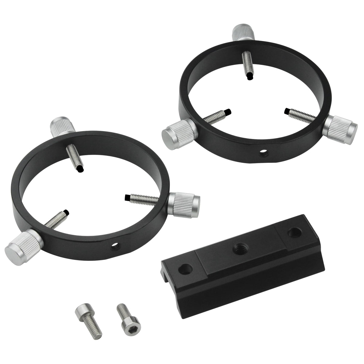 Astromania Adjustable Guiding Scope Ring Set With Plate - 69 Mm Inside Diameter (Pair) - For Telescope Tube Diameter Or Finders 43 To 68Mm The Guide Scope Rings From Astromania Optics Allow A Reliable And Above All Stable Adaption Of Telescopes Parallel To The Main Instrument. With The Knurled Thumb Screws, The Guide Scope Is Adjustable And You Can Centre A Sufficiently Bright Star In The Eyepiece Or The The Autoguider. And The Tube Rings Are Suitable For Bigger Finder Scopes, Too. The Adaption Of The Tube Rings To The Telescope. The Guiding Scope Ring Set Has A Vixen Style Dovetail Bar That Can Be Mounted To Your Telescope In Different Ways. First, It Fits The Standard Dovetail Finder Scope Base Included On Many Telescopes. Simply Slide It Into The Dovetail Base, Then Tighten The Thumbscrew On The Base To Secure The Guide Scope In Place. The Mounting Bar Has Three Threaded Through-Holes: The Center Hole Has ''-20 Threads And The Two Larger Holes On Either Side Of Center Have M8 X 1.25 Threads. To Attach The Guide Scope Bracket To A Universal Dovetail Plate, One Way Would Be To Insert A ''-20 Socket Head Capscrew Of Proper Length Up Through The Dovetail Plate And Into The Center Hole Of The Brackets Dovetail Bar. Tighten The Bolt Firmly With An Allen Wrench. Then Install The Universal Plate Onto Your Telescopes Tube Rings Or Radius Blocks. Alternatively You Could Attach The Bracket Using Two M8X1.25 Screws In The Same Manner.
