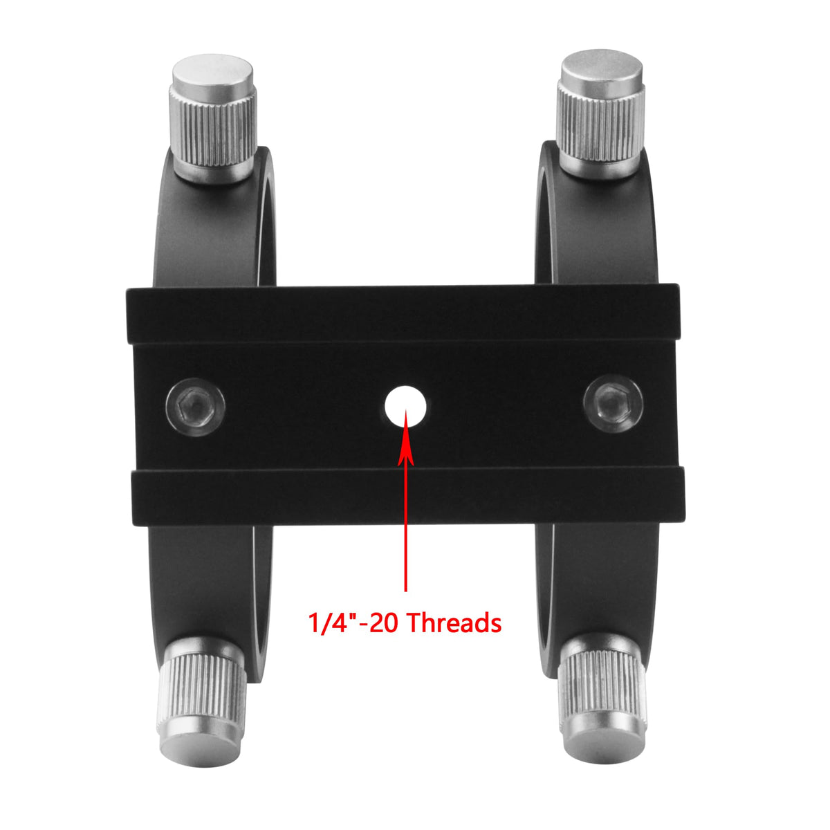 Q: How do I mount the guiding scope rings to my telescope?A: To mount the guiding scope rings, use the included Vixen style dovetail bar. Simply slide it into the dovetail base of your telescope and tighten the thumbscrew to secure it in place. Additionally, the mounting bar features threaded holes for further customization.
