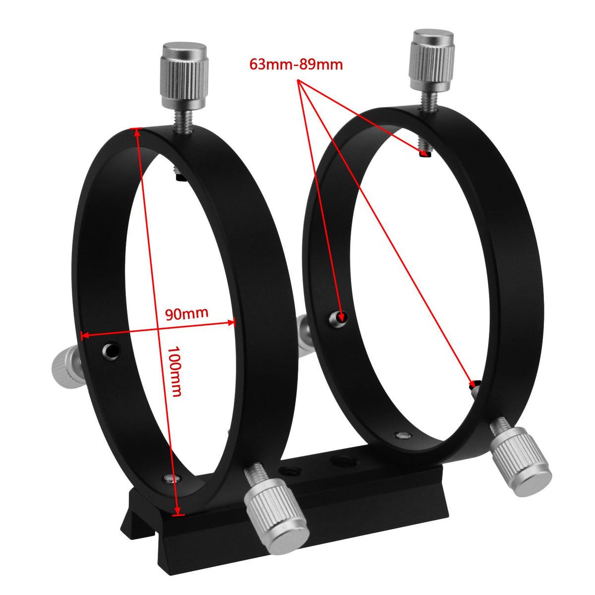 Astromania Adjustable Guiding Scope Ring Set With Plate - 90 Mm Inside Diameter (Pair) - For Telescope Tube Diameter Or Finders 63 To 89Mm The Guide Scope Rings From Astromania Optics Allow A Reliable And Above All Stable Adaption Of Telescopes Parallel To The Main Instrument. With The Knurled Thumb Screws, The Guide Scope Is Adjustable And You Can Centre A Sufficiently Bright Star In The Eyepiece Or The The Autoguider. And The Tube Rings Are Suitable For Bigger Finder Scopes, Too. The Adaption Of The Tube Rings To The Telescope. The Guiding Scope Ring Set Has A Vixen Style Dovetail Bar That Can Be Mounted To Your Telescope In Different Ways. First, It Fits The Standard Dovetail Finder Scope Base Included On Many Telescopes. Simply Slide It Into The Dovetail Base, Then Tighten The Thumbscrew On The Base To Secure The Guide Scope In Place. The Mounting Bar Has Three Threaded Through-Holes: The Center Hole Has ''-20 Threads And The Two Larger Holes On Either Side Of Center Have M8 X 1.25 Threads. To Attach The Guide Scope Bracket To A Universal Dovetail Plate, One Way Would Be To Insert A ''-20 Socket Head Capscrew Of Proper Length Up Through The Dovetail Plate And Into The Center Hole Of The Brackets Dovetail Bar. Tighten The Bolt Firmly With An Allen Wrench. Then Install The Universal Plate Onto Your Telescopes Tube Rings Or Radius Blocks. Alternatively You Could Attach The Bracket Using Two M8X1.25 Screws In The Same Manner.