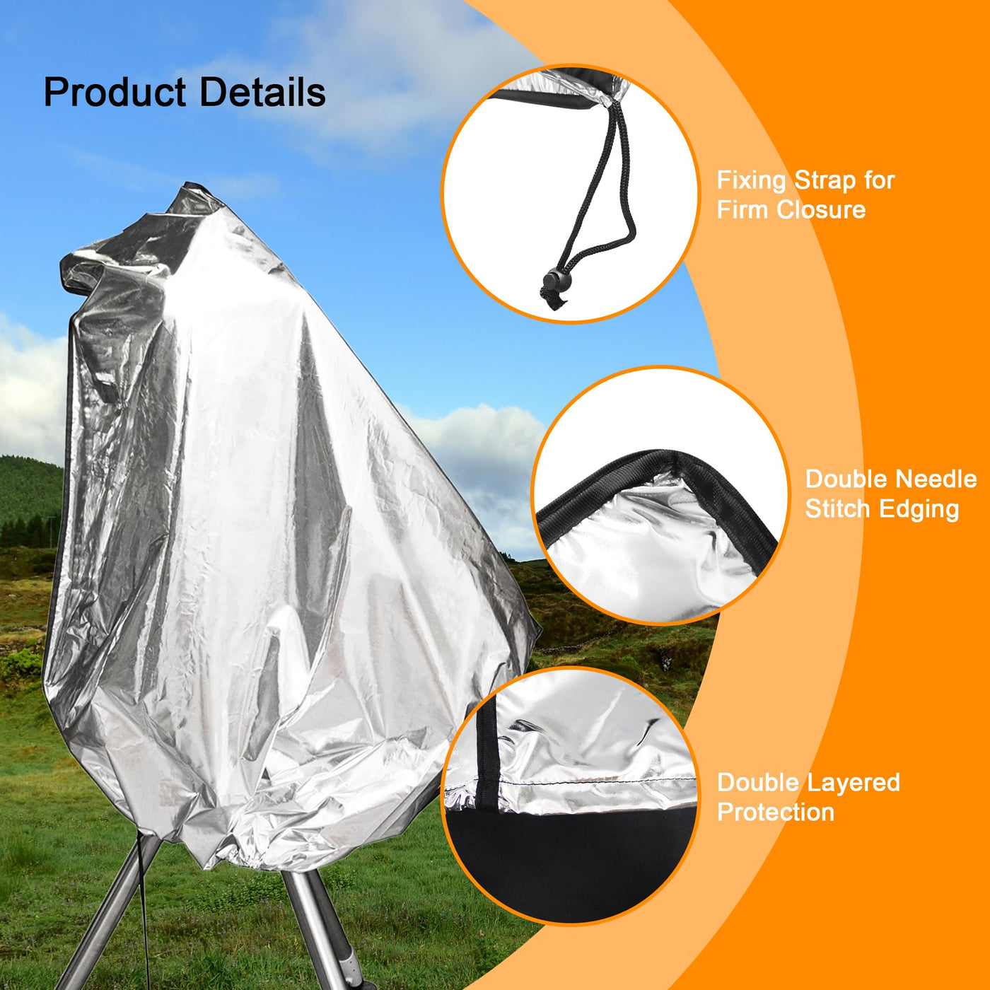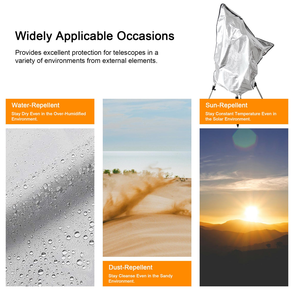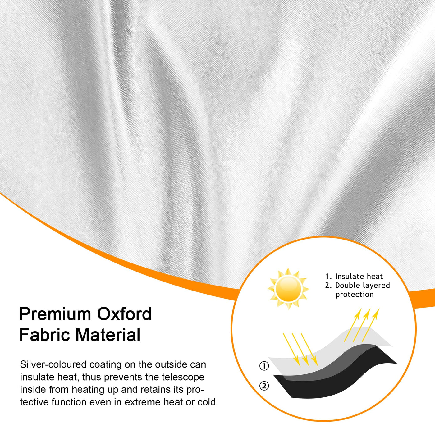 Q: What features make this telescope cover thermally stable?A: The cover features a silver-coloured coating on the outside that insulates heat, preventing the telescope from overheating. This thermal stability ensures that the material retains its protective function even in extreme weather conditions, both hot and cold.