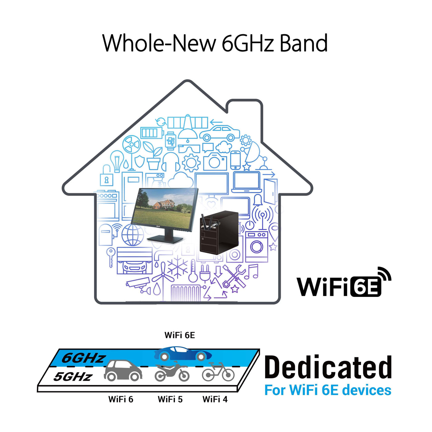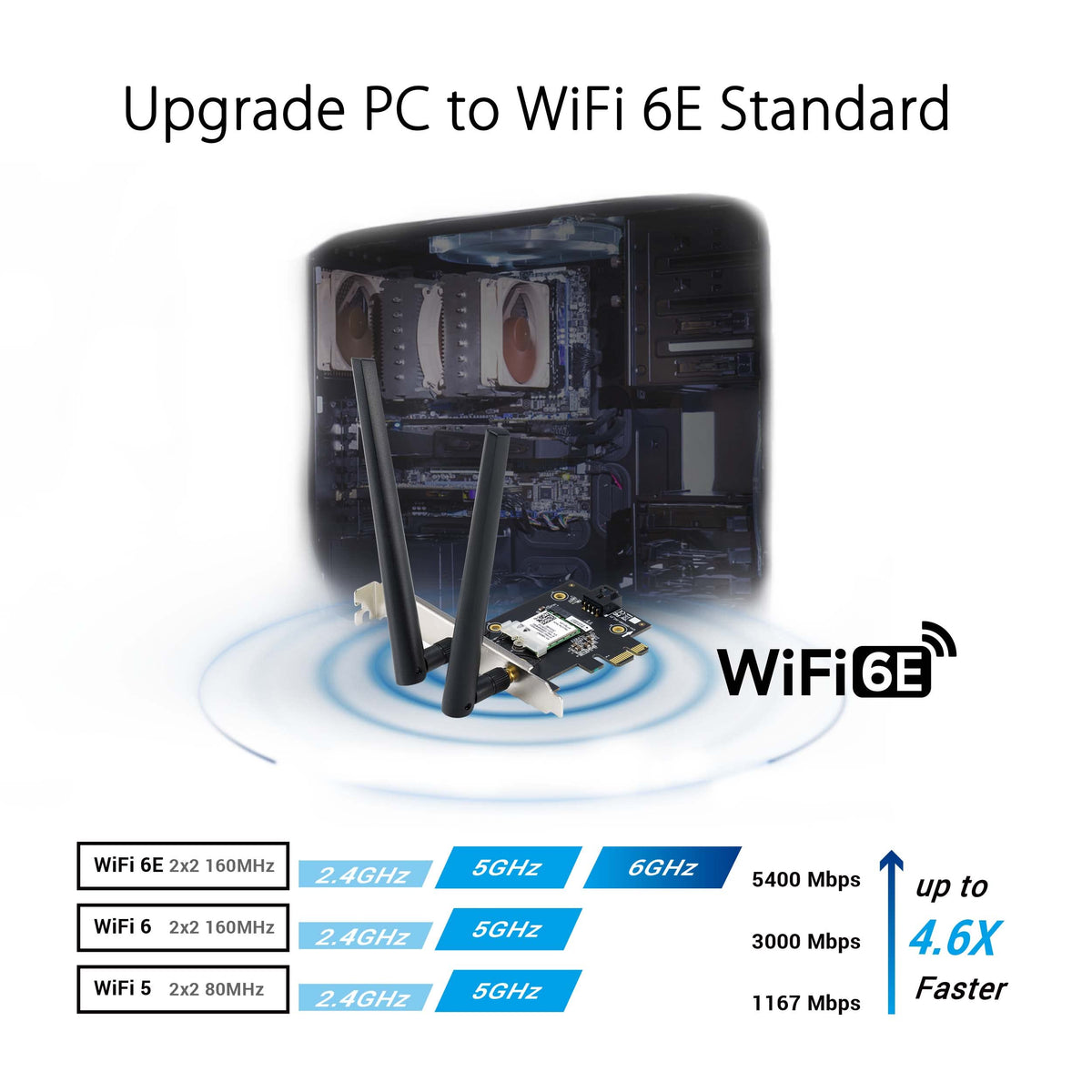Asus Pce-Axe5400 Is A Wifi 6E Pcie Card That Allows Your Pc To Connect To A Wifi 6E Router Via The Dedicated 6 Ghz Band. This Means It Will Not Compete For Bandwidth With Non-Wifi 6E Devices. The 6 Ghz Band Provides Up To Seven Extra 160 Mhz Channels, Providing More Bandwidth, More Flexibility, And Less Congestion. Disclaimer: Actual Data Throughput And Wifi Coverage Will Vary From Network Conditions And Environmental Factors, Including The Volume Of Network Traffic, Building Material And Construction, And Network Overhead, Result In Lower Actual Data Throughput And Wireless Coverage.