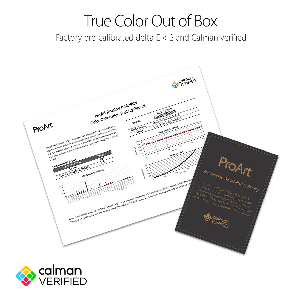 Q: What color accuracy can I expect from this monitor?A: The ASUS ProArt PA329CV is factory calibrated for color accuracy with a Delta E of less than 2, ensuring true-to-life colors that are essential for professional content creation.