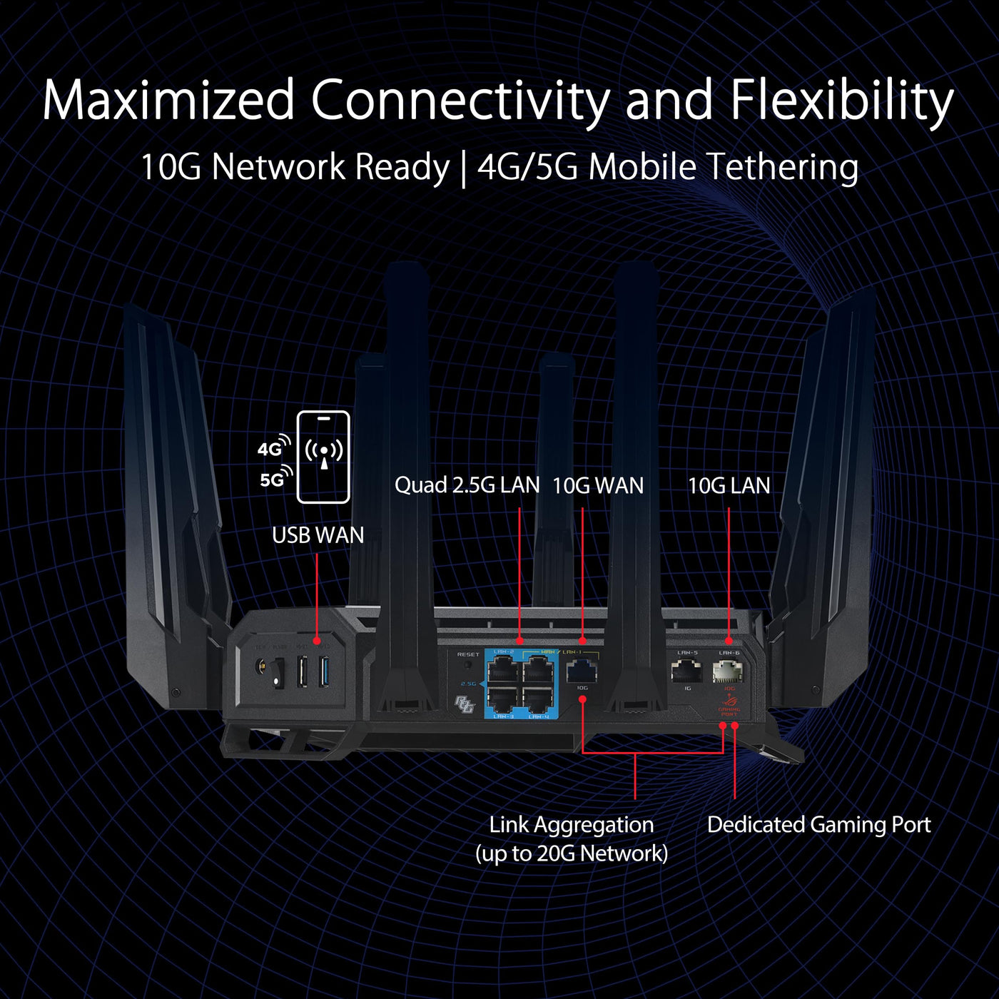 The Asus Rog Rapture Gt-Be98 Pro Quad-Band Wifi 7 Gaming Router Is Beyond Fast. With Dual 6 Ghz Bands, Dual 10Gbps Ports, And New Wifi7 Technlogies Such As Multi-Link Operation, Achieve Speeds Of Up-To 30Gbps And Push The Boundaries Of Whats Possible In Networking. Disclaimer: Actual Data Throughput And Wifi Coverage Will Vary From Network Conditions And Environmental Factors, Including The Volume Of Network Traffic, Building Material And Construction, And Network Overhead, Result In Lower Actual Data Throughput And Wireless Coverage.