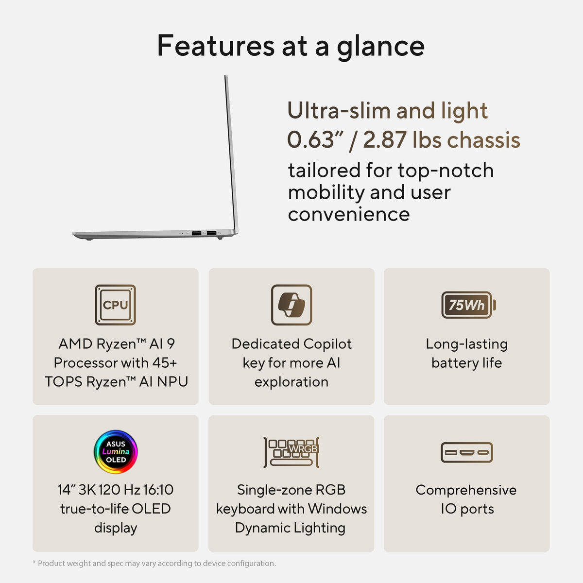 The Asus Vivobook S 14 Transforms Your Laptop Experience With Cutting-Edge Technology And A Sleek Minimalist Design. Powered By The Amd Ryzen 9 Processor, It Delivers Top-Notch Performance With Up To 45+ Tops Npu, Enhancing Your Productivity To The Next Level And Unlocking Brand New Ai Experiences. The Dedicated Copilot Key Provides Instant One-Touch Access To Ai Capabilities. With A Slim Profile, Weighing 2.87 Lbs, And Up To A 75 Wh Battery Life, Its Designed For On-The-Go Convenience. The Laptop Boasts A Stunning Up To 3K Asus Lumina Oled Display, An Ergonomic Keyboard With Rgb Backlighting, An Extra-Large Touchpad, And An Asus Aisense Camera. Its Your Perfect Companion For Modern Life.