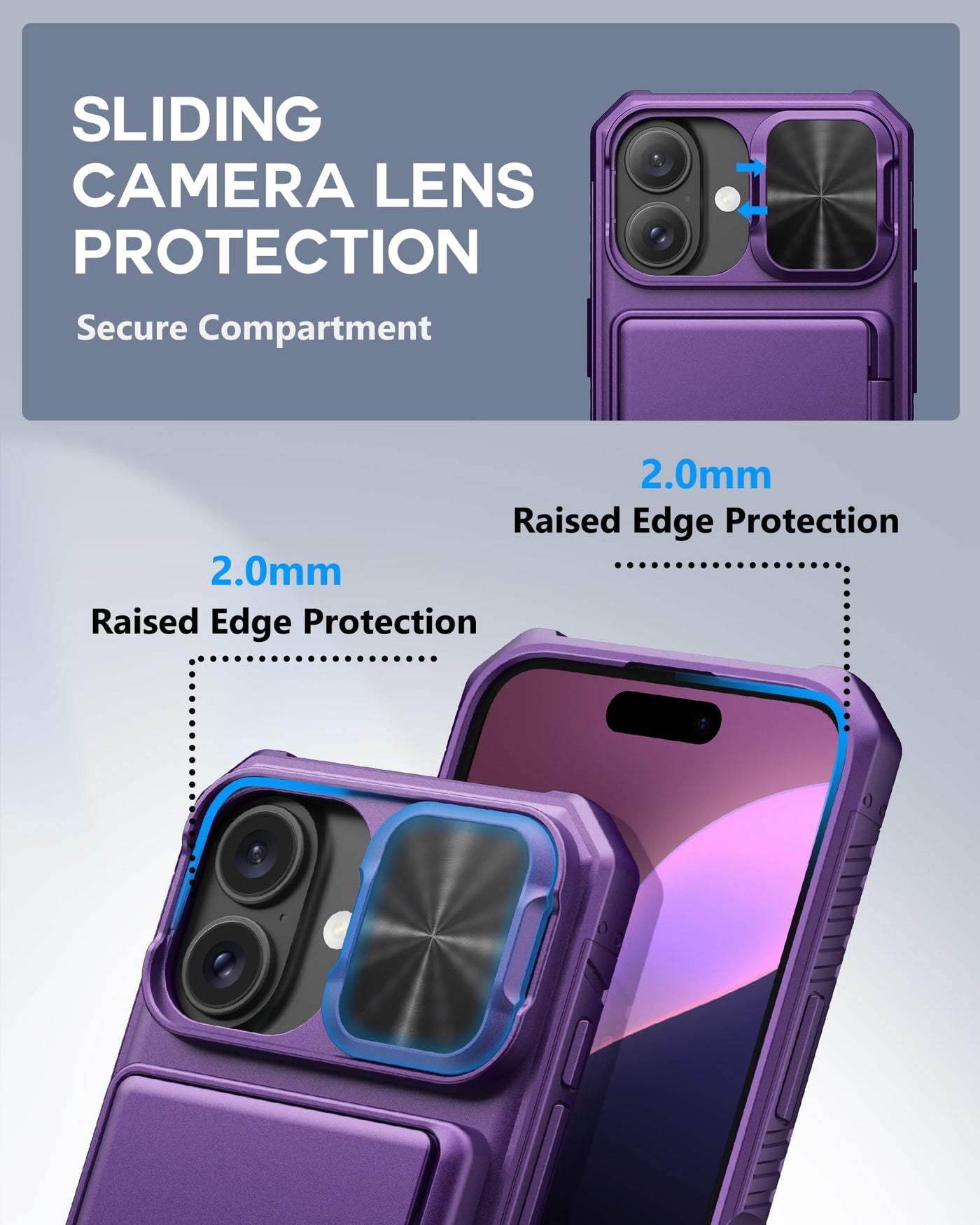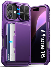 Atatoo For Iphone 16 Case Wallet With Card Holder (Store 3 5 Cards) & Slide Lens Cover, Military Grade Protection, Rugged Shockp