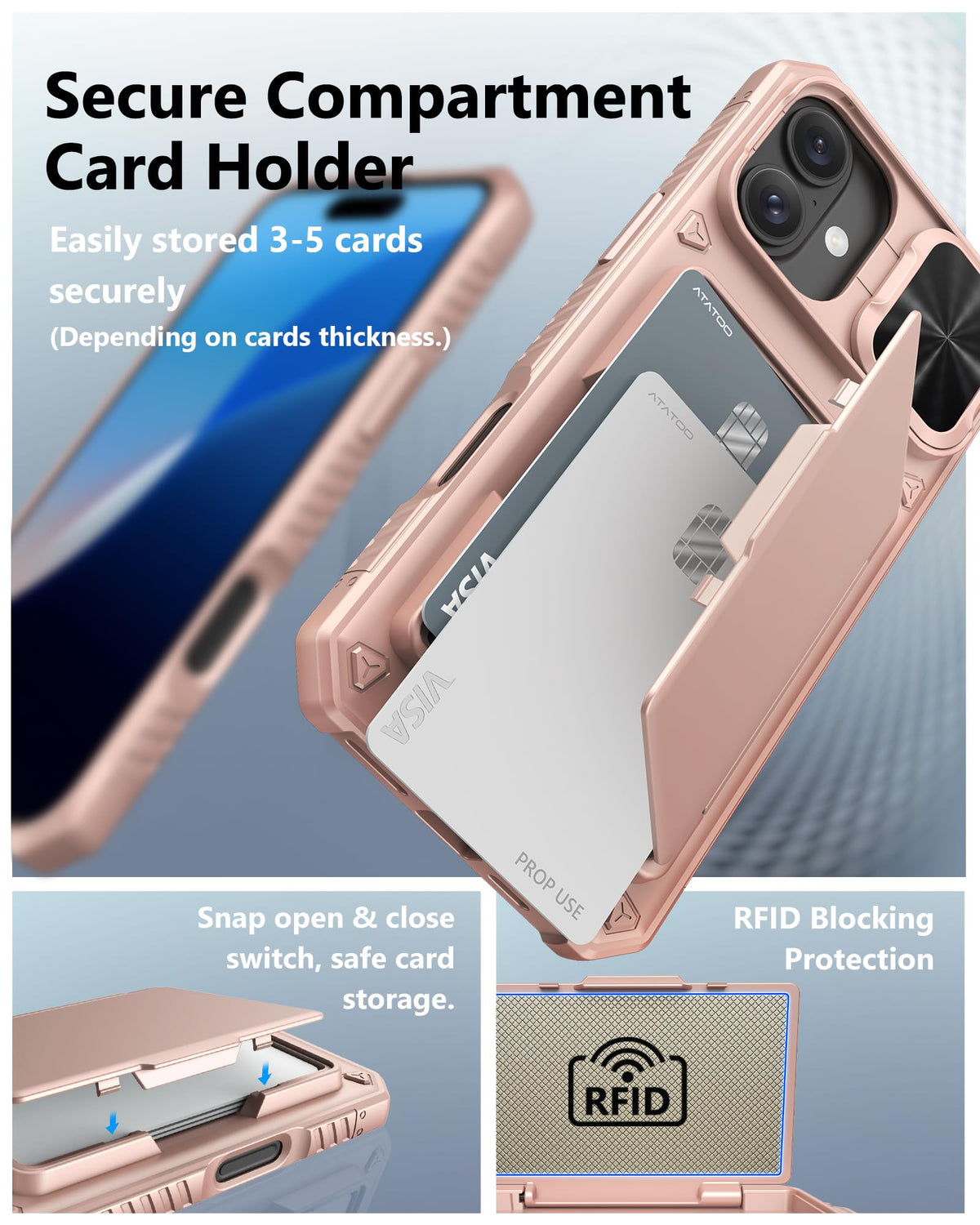 Atatoo For Iphone 16 Plus Case Wallet, Built In Card Holder (Store 3 5 Cards) & Slide Lens Cover, Military Grade Protection, Sho