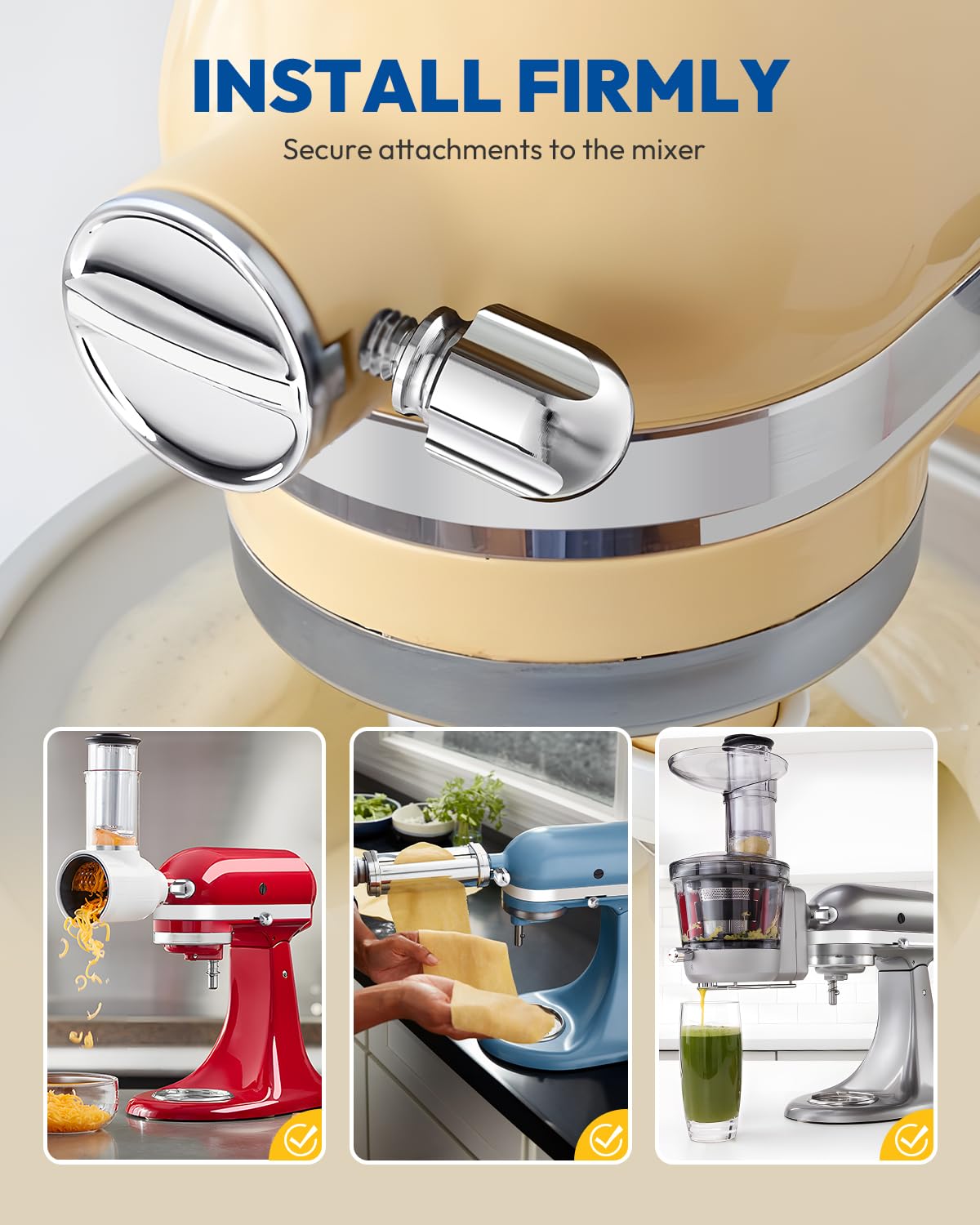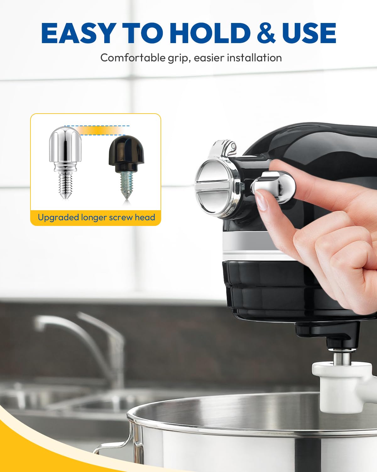 Q: How does the longer screw head improve functionality?A: The longer screw head allows for easier and more secure attachment of various mixer accessories, ensuring that they remain safe and stable during use.