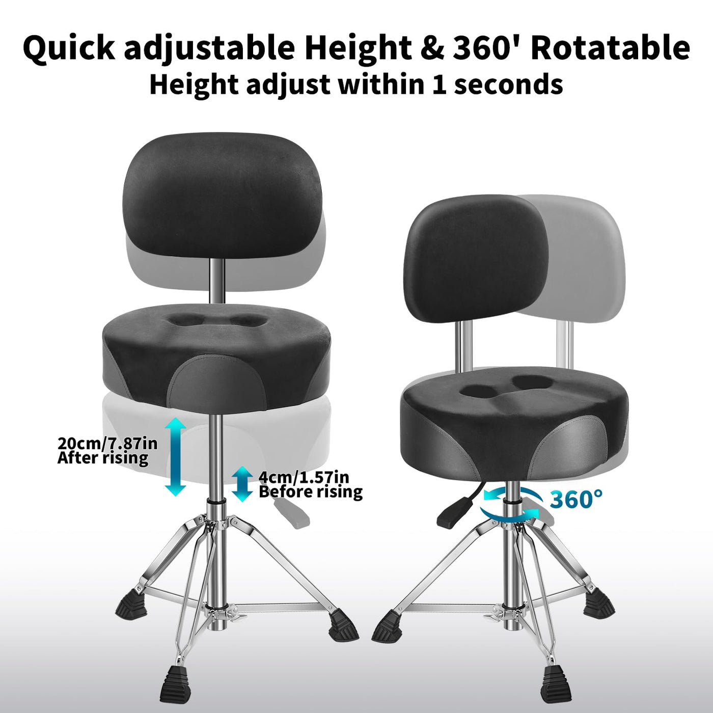 Augioth Drum Throne Features Hydraulic Height Adjustment And A Premium 5-Inch Thick Ergonomic Seat Cushion. Its Upgraded Triangular Base With Non-Slip Rubber Feet Provides Exceptional Stability.