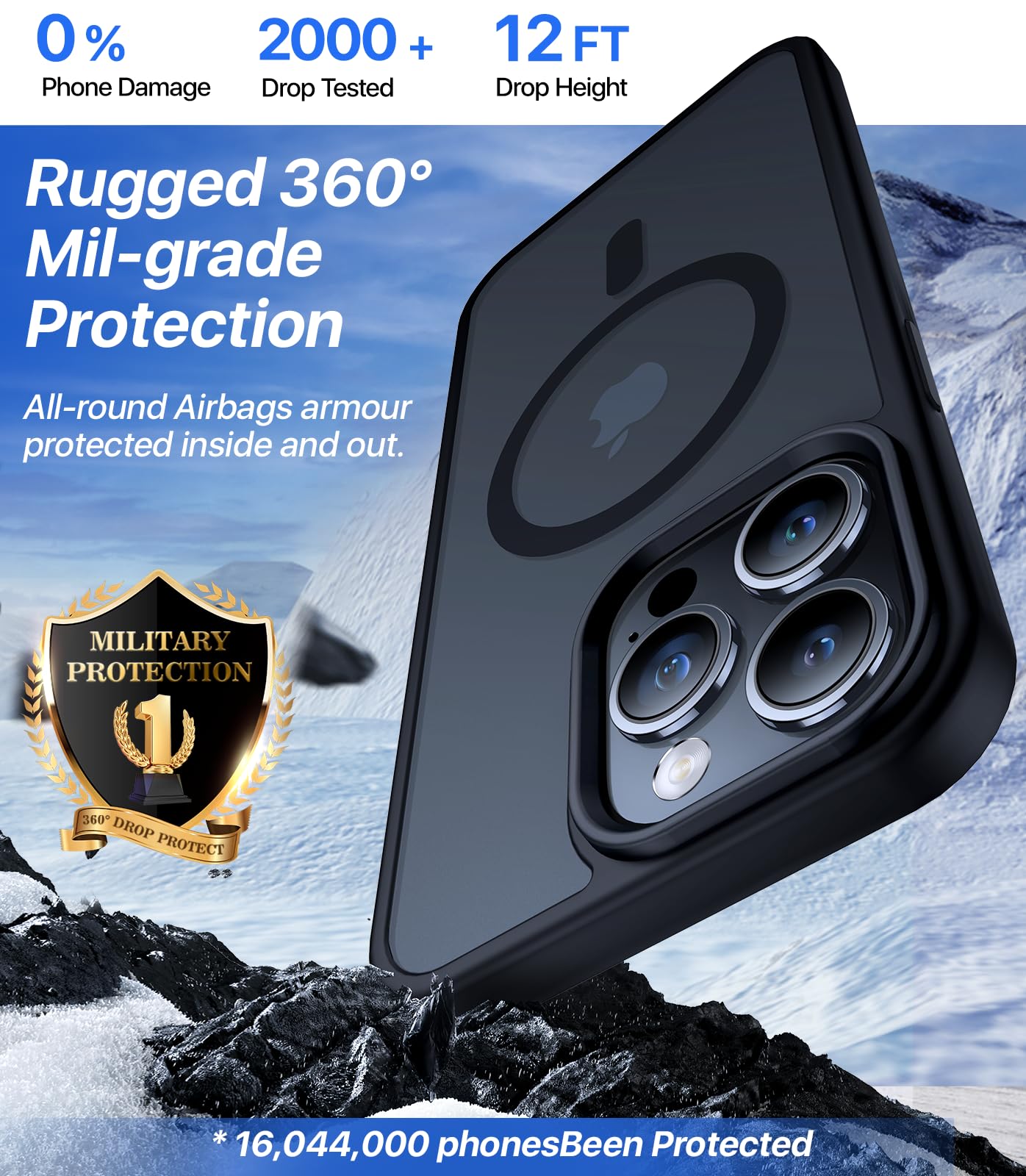 Q: How does the case provide military-grade drop protection?A: This case features a 360-degree shock-absorbing airbag design, an explosion-proof hard back, and a 4-layer cushioning structure, which collectively disperse impact force and have passed 4,000 drop tests from heights of 12 feet, ensuring maximum protection for your iPhone 16 Pro Max.