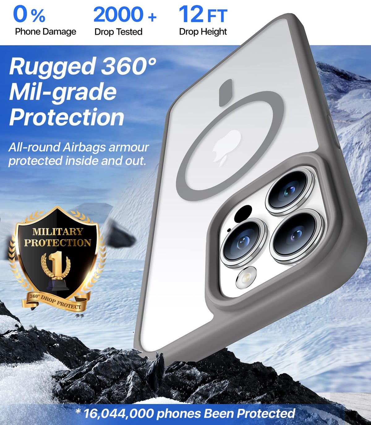 Q: How effective is the drop protection of this iPhone 16 Pro Max case?A: The case offers trusted 360° military-grade protection, having passed 4,000 drop tests from 12 feet, ensuring '0' damage with its shock-absorbing airbags and robust construction.