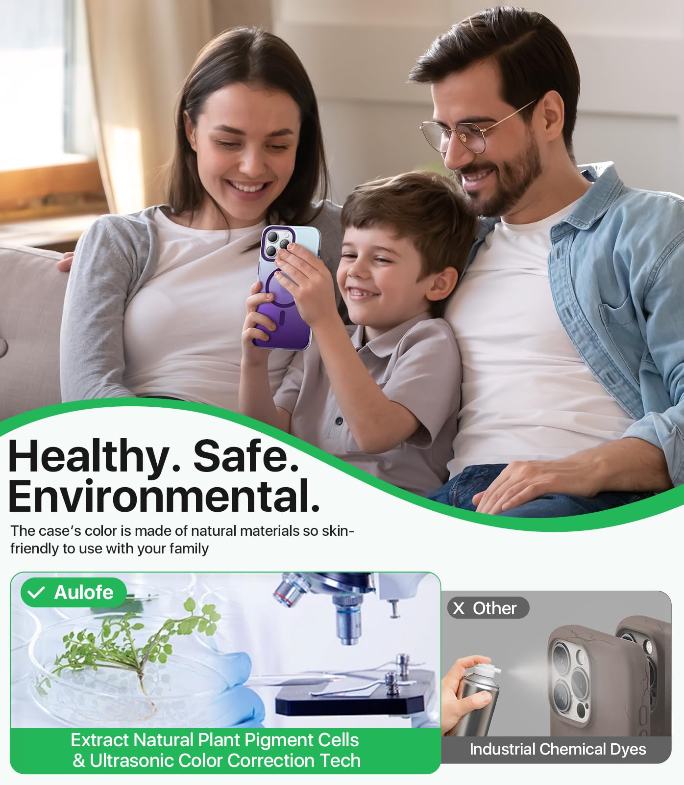 Q: What materials are used in the Aulofe case, and are they environmentally friendly?A: The Aulofe case is made from a blend of plant-based materials and Thermoplastic Polyurethane. It is designed to be skin-friendly, healthier, and environmentally friendly, incorporating a nano-oleophobic antioxidant layer that resists stains.