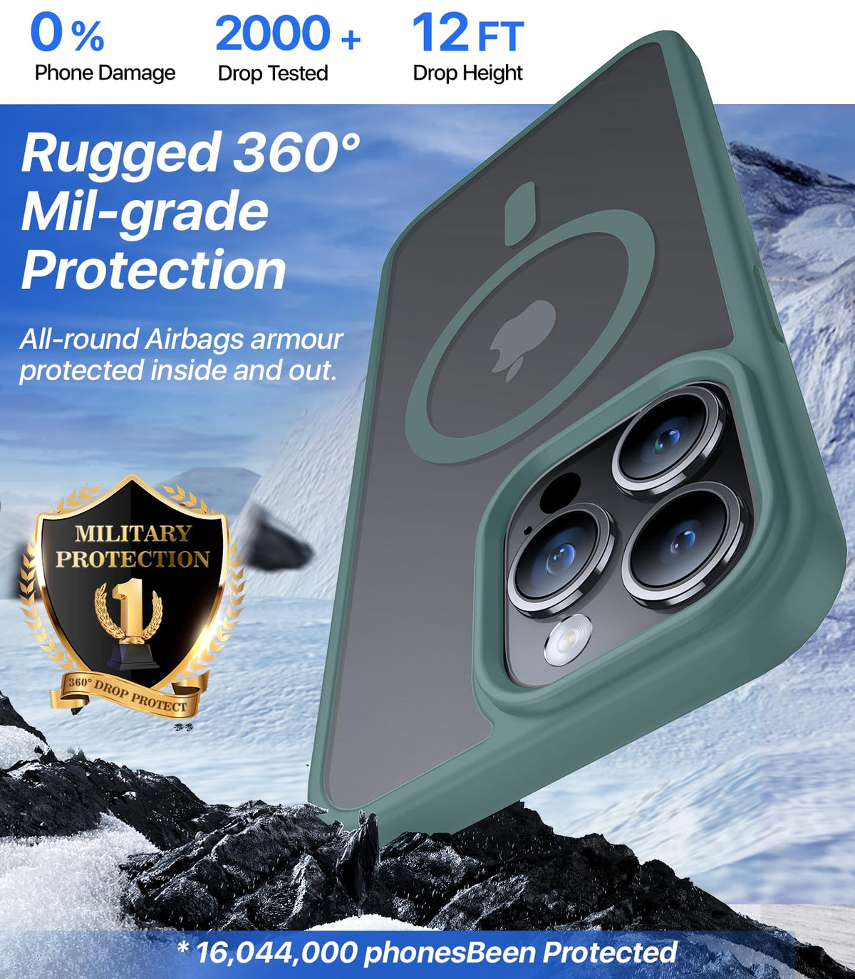 Q: What kind of protection does this case offer for the iPhone 16 Pro Max?A: This case offers trusted 360° military-grade protection, featuring shock-absorbing airbags, an explosion-proof hard back, and a 4-layer cushioning structure to effectively disperse impact forces and protect your device during drops.