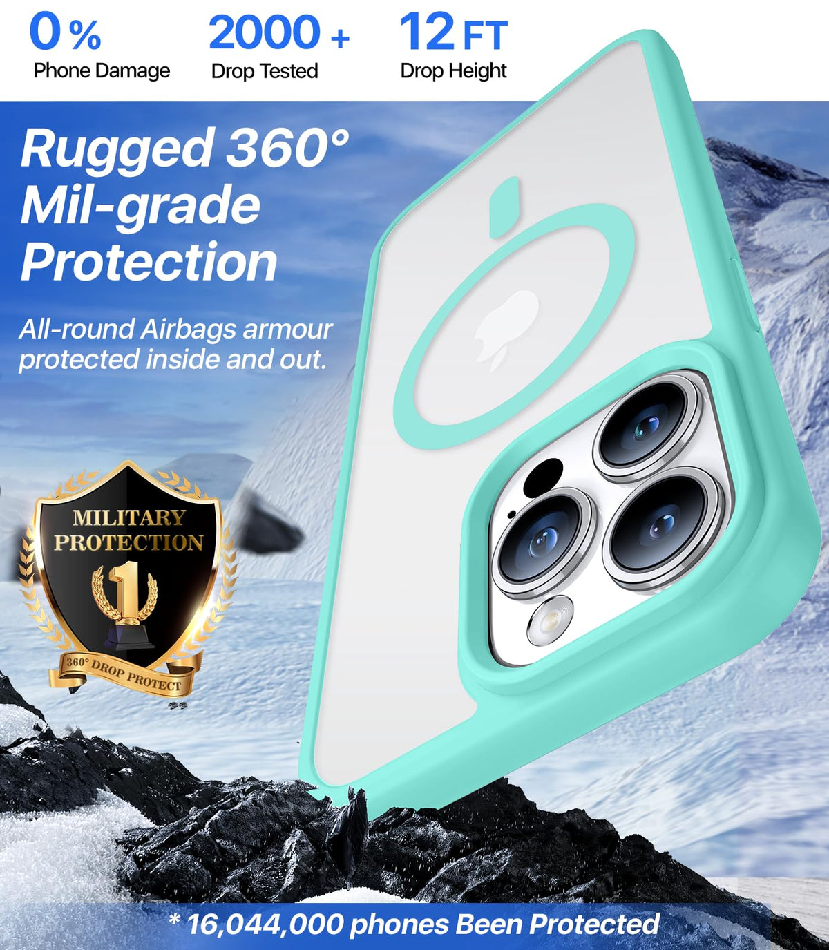 Q: What level of protection does this case offer for the iPhone 16 Pro Max?A: The case offers trusted 360° military-grade protection, featuring shock-absorbing airbags, an explosion-proof hard back, and a 4-layer cushioning structure that has successfully passed 4,000 drop tests from a height of 12 feet.