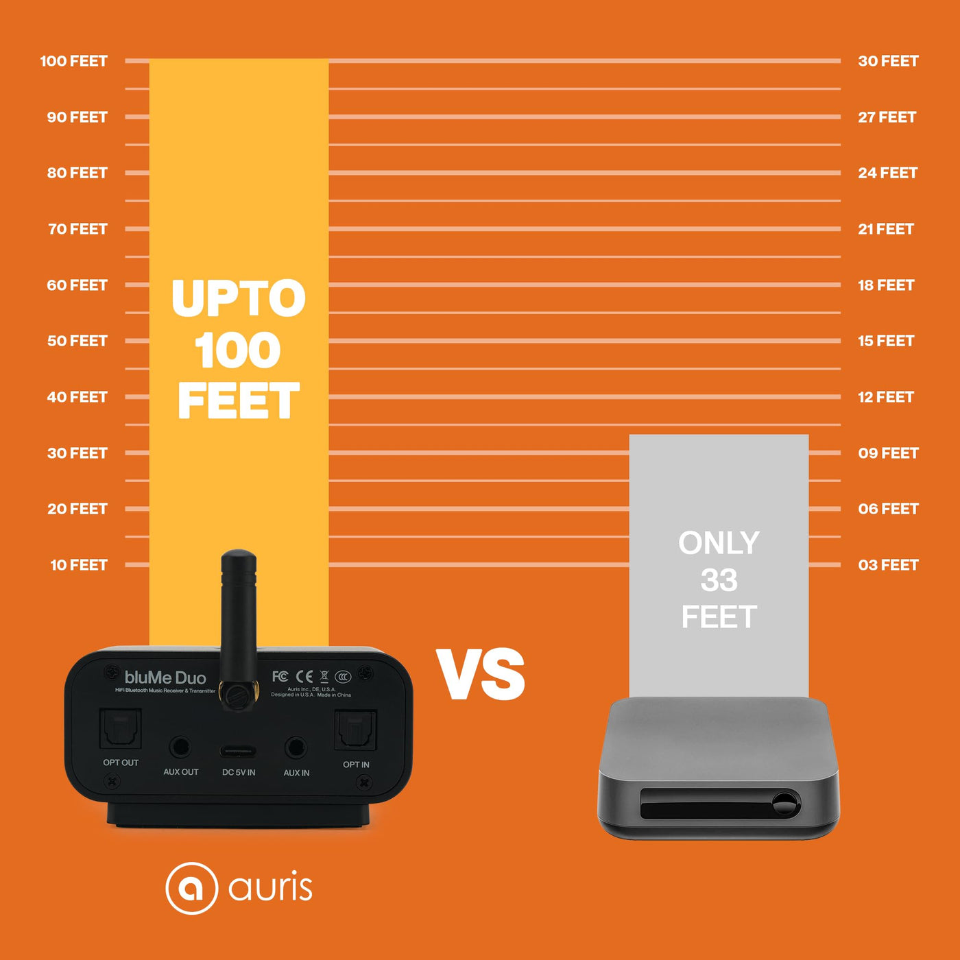 Q: How does the Bluetooth range of the Auris Blume Duo compare to other adapters?A: The Auris Blume Duo utilizes special circuitry and an external gain antenna to extend its wireless range up to 30 meters (100+ feet), providing a glitch-free audio experience even through multiple walls, which is superior to many standard Bluetooth adapters.