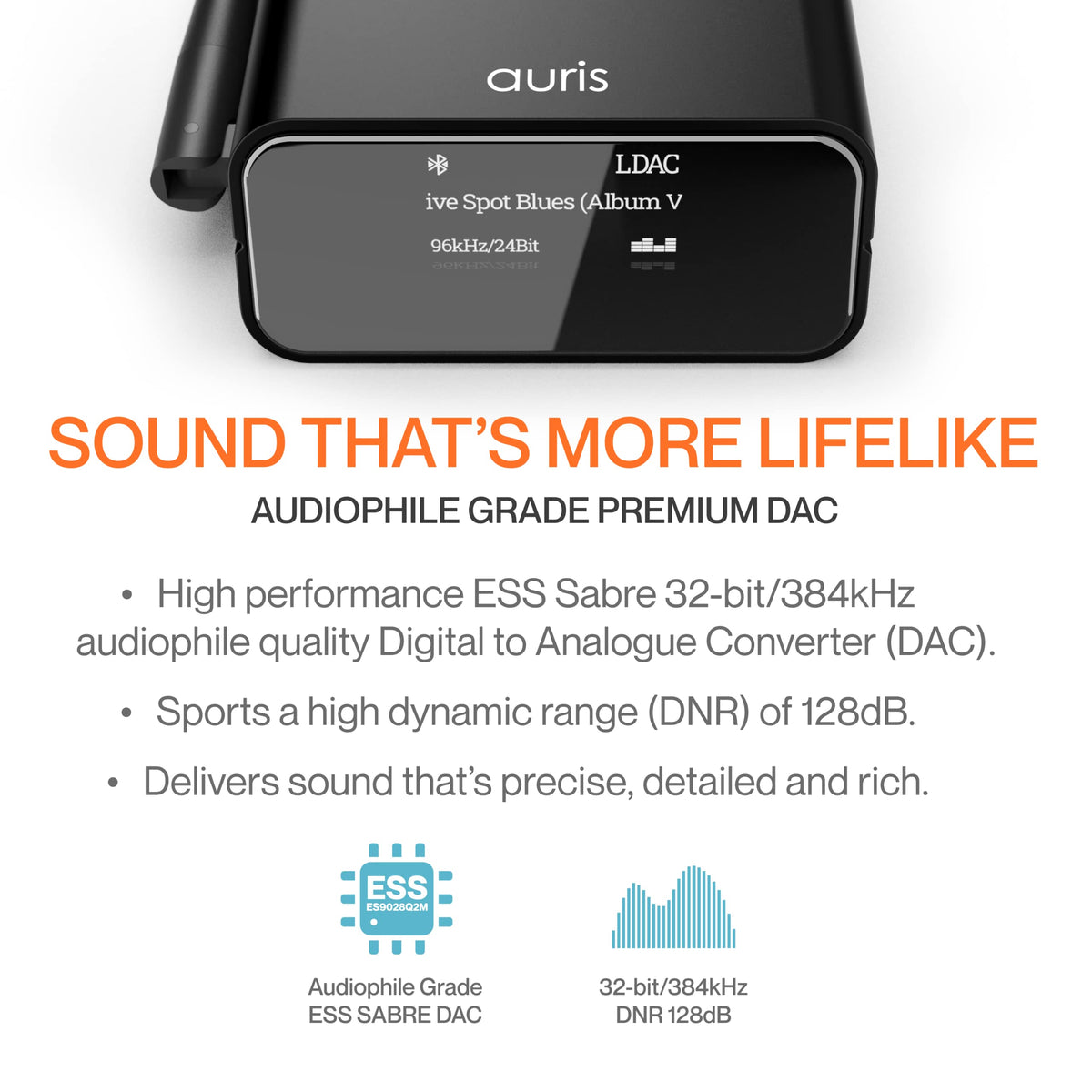 Q: How does the Auris Blume Pro improve audio quality?A: The Auris Blume Pro features a high-performance 32-bit DAC and supports advanced audio codecs like LDAC and aptX HD, providing a lossless audio experience that significantly enhances sound quality compared to standard Bluetooth receivers.