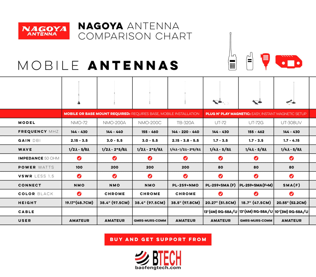 The Nagoya Ut-72 Is A Dual-Band Magnet Mount Antenna With Over 4 Db Of Gain. It Is Designed To Be Used With Your Mobile Or Handheld Radio. An Included Super Flexible Sma Adapter Cable Allows For Easier Installation Right To Your Handheld Radio. It Will Help Improve Your Signal By Mounting The Antenna On Any Vehicle With A Steel Body (Like Cars).The Ut-72 Antenna, When Mounted Vertically Is Omni-Directional Which Allows It To Receive Signal From All Directions. It Uses A Very Heavy Duty Rare Earth Magnet On It'S 3.25 Inch Magnetic Mount And Is The Perfect Antenna For Cars, Pickup Trucks, Vans And Suvs.With 14 Feet Of Heavy Duty Rg-58 You Are Able To Set Up Your Antenna On Almost Any Vehicle Application. The Antenna Itself Is 2.5Mm Thick Compared To The Usual 1.5Mm Antennas Found On Most Vehicle Magnetic Mounts.Included In The Package Is A Rg316 Sma Jumper That Allows Easier Installation On Your Handheld Radio. The Jumper Has Been Tested At The Perfect Length To Resist Line Loss - Insuring The Maximum Performance From Your Radio.Package:1X Nagoya Ut-72 Magnetic Mount Antenna With Pl-259 With ~14' Rg-581X Sma Adapter To Uhf So-239 (~10 Inches)Compatible With:All Mobile Radios With Uhf (So-239) Connectorsbtech Mobile Radops: Uv-25X2, Uv-50X2, Uv-25X4* (*Uv-25X4 - Reccomended Antenna Is The Tb-320A With Rb-50 Mount)Btech Handheld Radios: Gmrs-V1, Murs-V1, Uv-5X3Baofeng: Bf-F8Hp, Uv-82C, Uv-82X, Uv-5R, Bf-888S And All Models With Sma-Femaleand Any Other Radio That Uses The Sma-Female Or So-239 Adapters.
