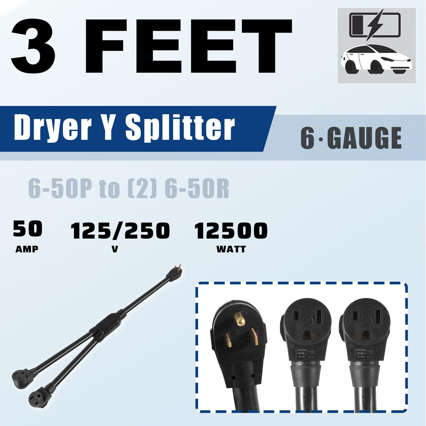 ?Product Details?The Prodcut Is An Extension And Splitter Power Cord Adapter And Y Adapter Power Cord. One Nema 6-50P Male Plug To Two Nema 6-50R Female Plugs | ?Product Material?Moulded With Electroplate Copper Terminal To Effectively Prevent Surface Oxidation | ?Industrial Grade?50 Amps / 250 Voltage | ?Multifunctional?It Can Be Used To Charge Numerous Vehicles, Including Motorhomes, Recreational Vehicles, And Generators. Before Using, Make Sure You'Ve Read The Instructions On The Cable And The Splitter, And Take All Necessary Safety Precautions If You'Ll Be Using It Outside | ?Service?Offers 1 Year Product Quality Support To Our Customers,If You Are Uncertain Of Any Problems, Please Contact Us