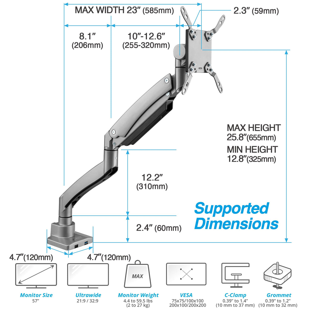 Avlt Single 17''-57'' Super Ultrawide Monitor Arm For Screens Up To 59.5 Lbs, Premium Aluminum Desk Stand, Adjustable Pneumatic Height, Full Motion Swivel Tilt Rotation, Usb-C & Usb-A Ports, Gray
