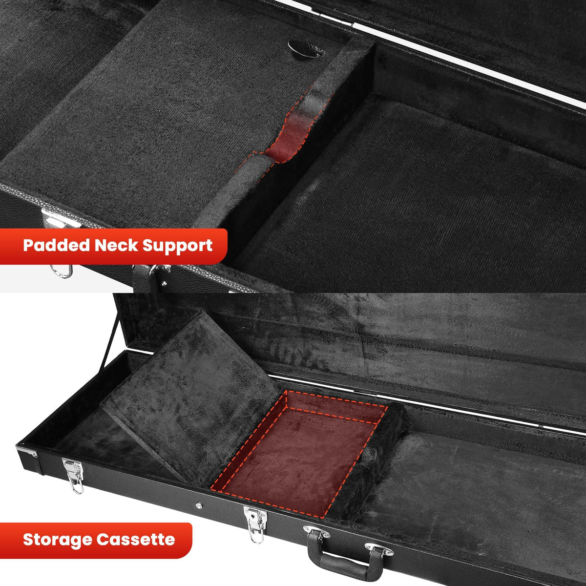 Features:- Specially Designed - 47 15/16 X 14 13/16 X 4 Electric Bass Guitar Case Features Hard Plywood Construction For Better Protection And Is Specially Designed And Crafted To Fit Most Electric Bass Guitars Perfectly- Durability & Protection - Sturdy Exterior Casing Is Made Of Hard Plywood Wrapped In Pu Leather For Long-Lasting Toughness And The Interior Is Made Of Molded Foam Lined With Plush Suede For Scratch Resistance And Shock Absorption- Stable & Secure - Comes With Sturdy Chrome Locks And Bumpers On The Bottom And Sides Of The Case For Extra Protection Against The Potential Of Damage, Intrusion Or Falling Over During Travels- Highly Portable - Comfortable Molded Handle Makes It Portable And Easily Transported Around, Even With Its Relatively Large Size And Great Load Bearing Capacity- Large Storage - With A Large Compartment In The Middle Of The Case For Easily Storing, Securing And Transporting Different Accessories Needed To Go Along With Your Guitarspecifications:- Product Outer Dimension(Lxwxh): 47 15/16 X 14 13/16 X 4 (121.7 X 37.7 X 10.2 Cm)- Product Inner Dimension(Lxwxh): 46 5/8 X 13 7/8 X 2 9/16 (118.4 X 35.3 X 6.5 Cm)- Materials: Plywood, Molded Foam, Suede Liner, Pu Leather- Net Weight: 14.3 Lbs (6.5 Kg)Package Contents:- 1X Electric Bass Guitar Wooden Case- 2X Keys- Package Content:- 1X Acoustic Guitar Wooden Case- 2X Keys