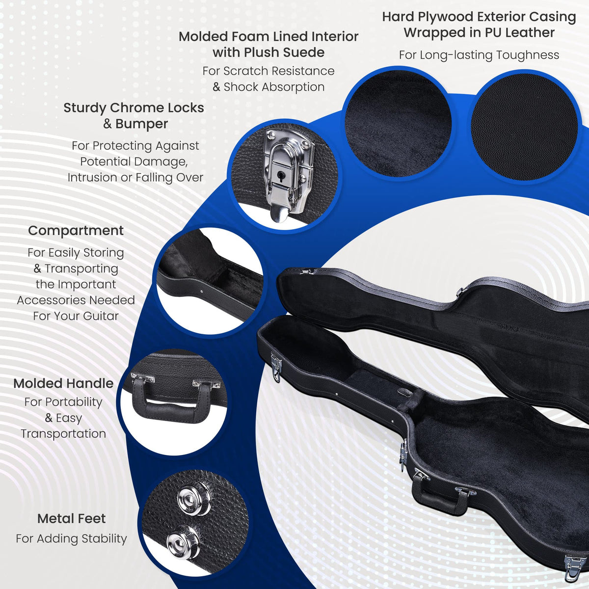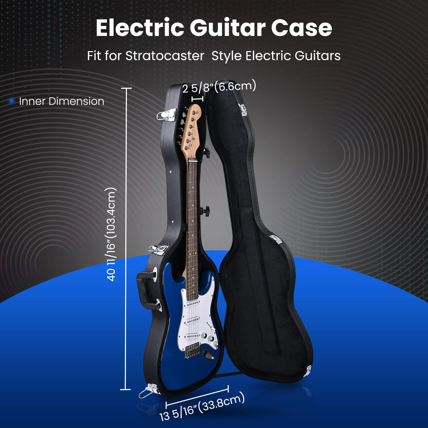 Features:- Specially Designed - 42 1/8 X 14 15/16 X 3 7/8 Electric Guitar Case Features Hard Plywood Construction For Better Protection And Is Specially Designed And Crafted To Fit Stratocaster Style Electric Guitars Perfectly- Durability & Protection - Sturdy Exterior Casing Is Made Of Hard Plywood Wrapped In Pu Leather For Long-Lasting Toughness And The Interior Is Made Of Molded Foam Lined With Plush Suede For Scratch Resistance And Shock Absorption- Stable & Secure - Comes With Sturdy Chrome Locks And Bumpers On The Bottom And Sides Of The Case For Extra Protection Against The Potential Of Damage, Intrusion Or Falling Over During Travels- Highly Portable - Comfortable Molded Handle Makes It Portable And Easily Transported Around, Even With Its Relatively Large Size And Great Load Bearing Capacity- Extra Storage - With A Compartment In The Middle Of The Case For Easily Storing, Securing And Transporting The Important Accessories Needed To Go Along With Your Guitarspecifications:- Product Outer Dimension(Lxwxh): 42 1/8 X 14 15/16 X 3 7/8 (107 X 38 X 9.8 Cm) - Product Inner Dimension(Lxwxh): 40 11/16 X 13 5/16 X 2 5/8 (103.4 X 33.8 X 6.6 Cm)- Materials: Plywood, Molded Foam, Suede Liner, Pu Leather- Net Weight: 6.6 Lbs (3 Kg)Package Contents:- 1X Electric Guitar Wooden Case- 2X Keysnotice: - Not Suitable For Left-Handed Guitar- This Case Is Only Suitable For Stratocaster Style Electric Guitars.
