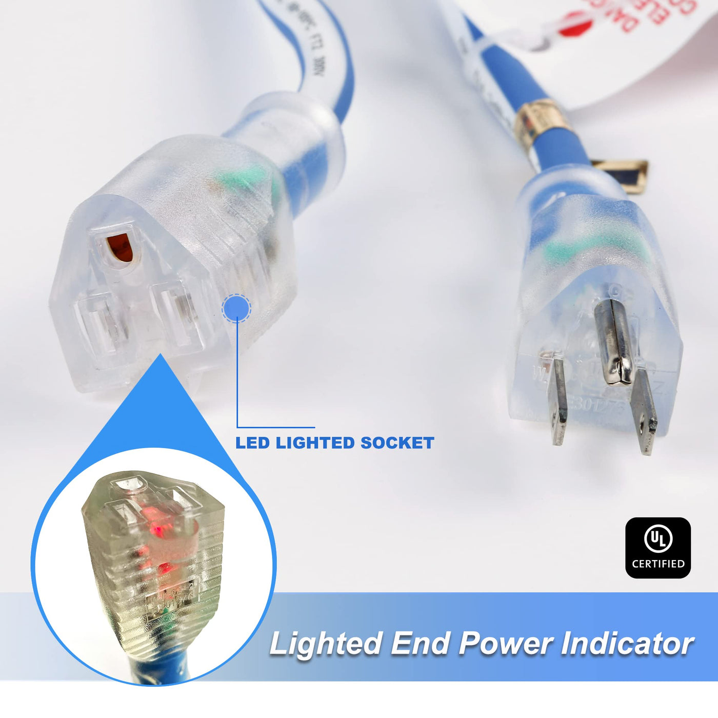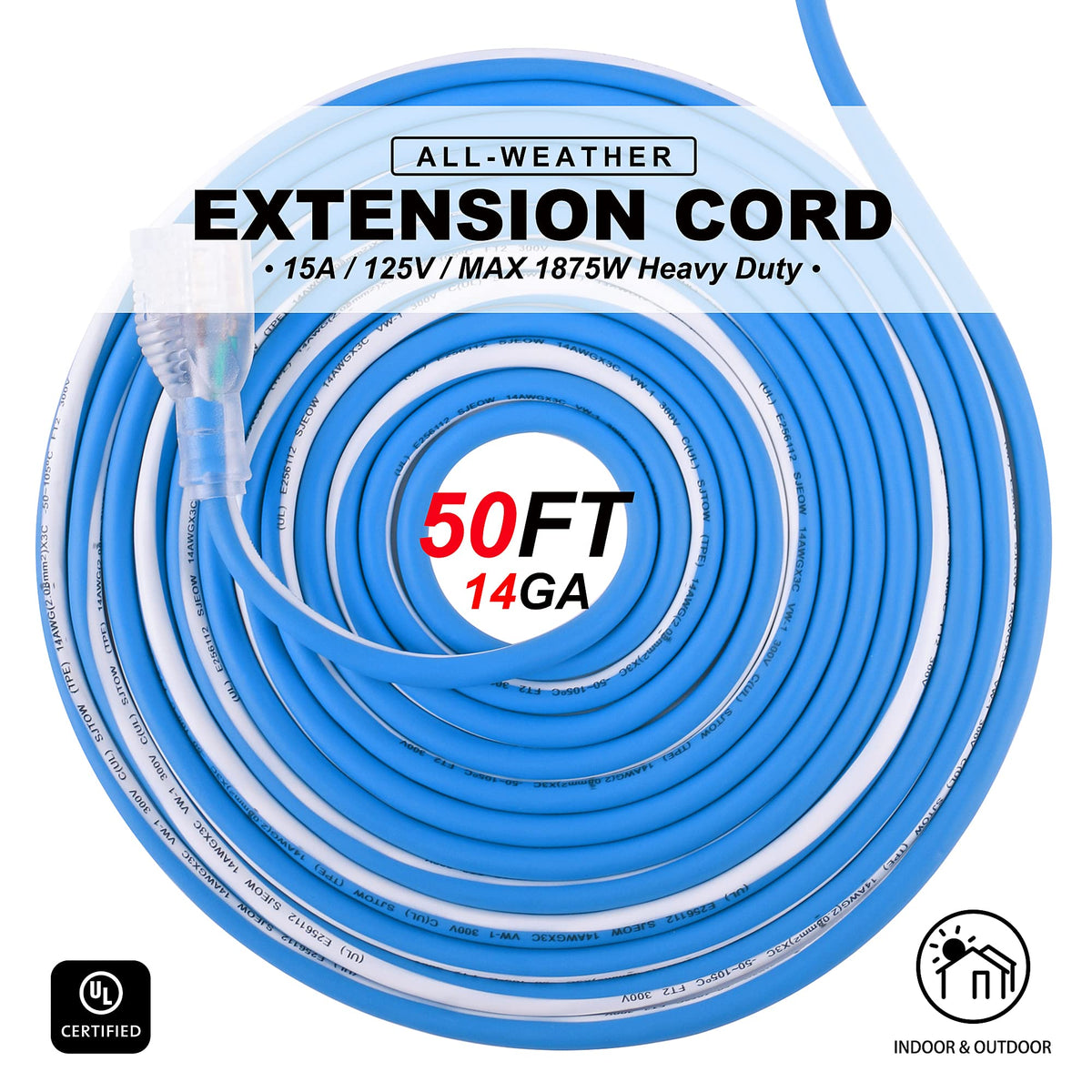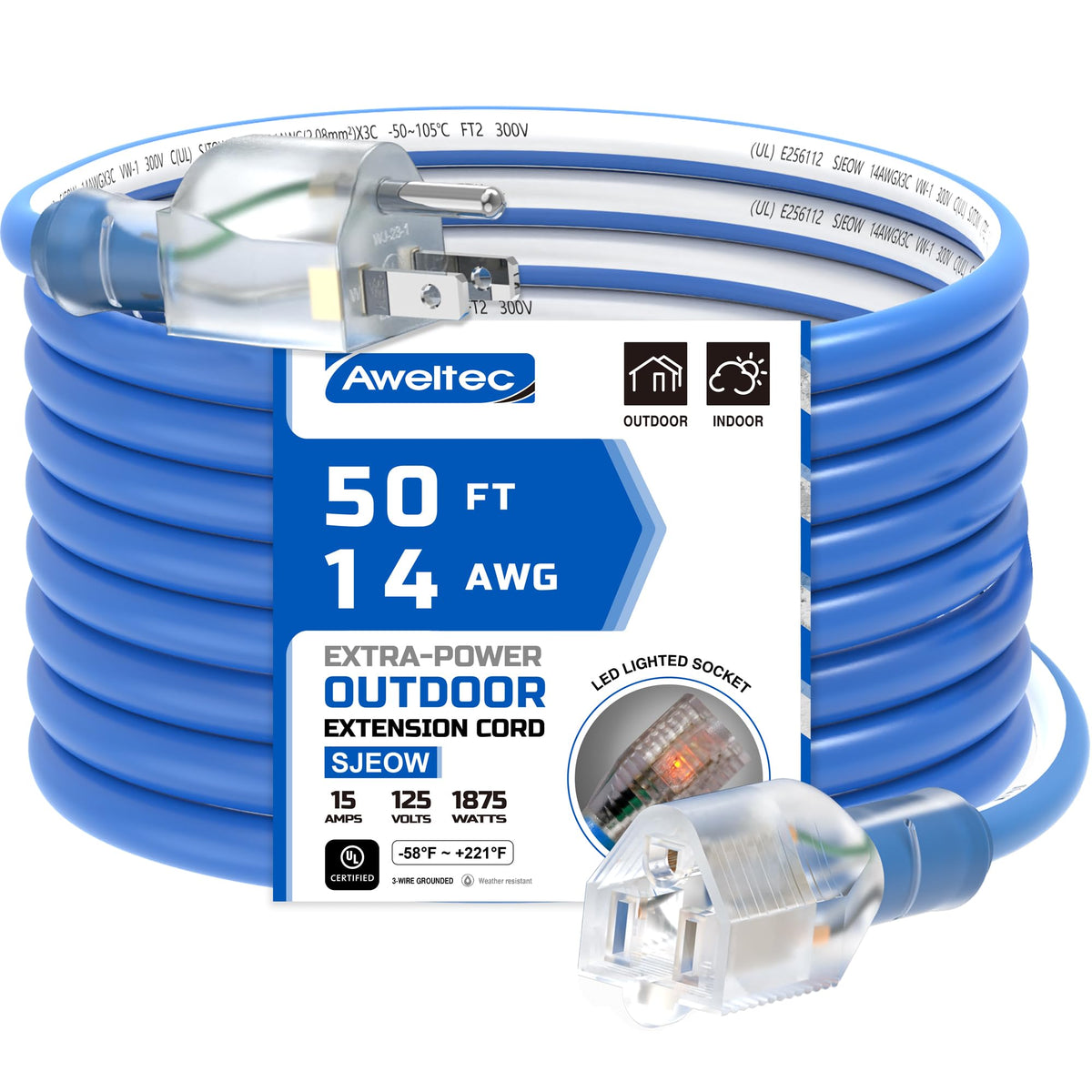 Aweltec Outdoor 14/3 Extension Cord 14Awg 50Ft 15Amp 1875Watts, Tpe Rubber Sjeow ( 58F To +221F) Lighted Power Cord, Blue + Whit