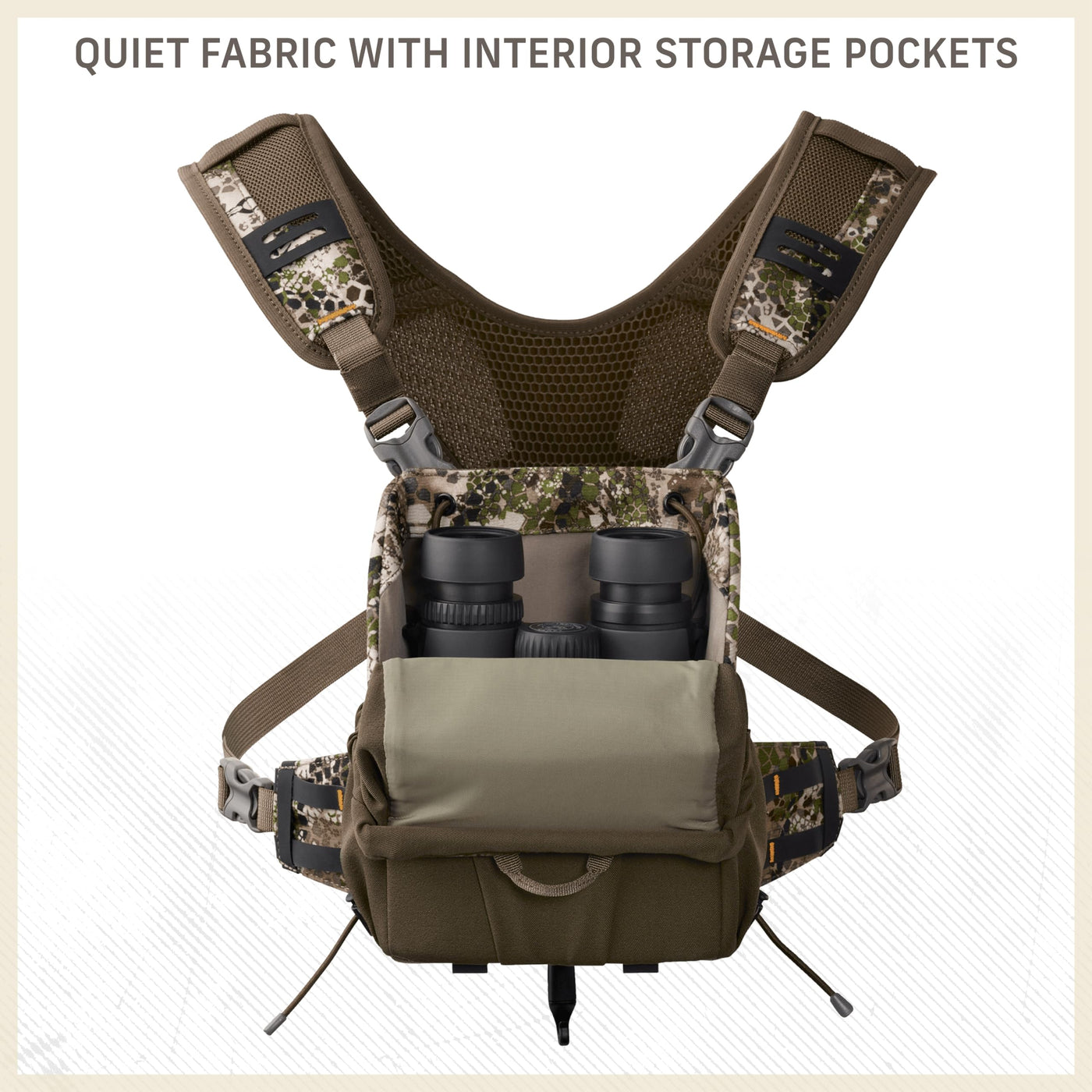 Q: What makes the Badlands Bino EZ binocular harness different from other harnesses?A: The Badlands Bino EZ features an adjustable tension-based bungee closure system for optimal binocular protection, along with ergonomic, quiet interior fabric that allows for discreet usage in the field.