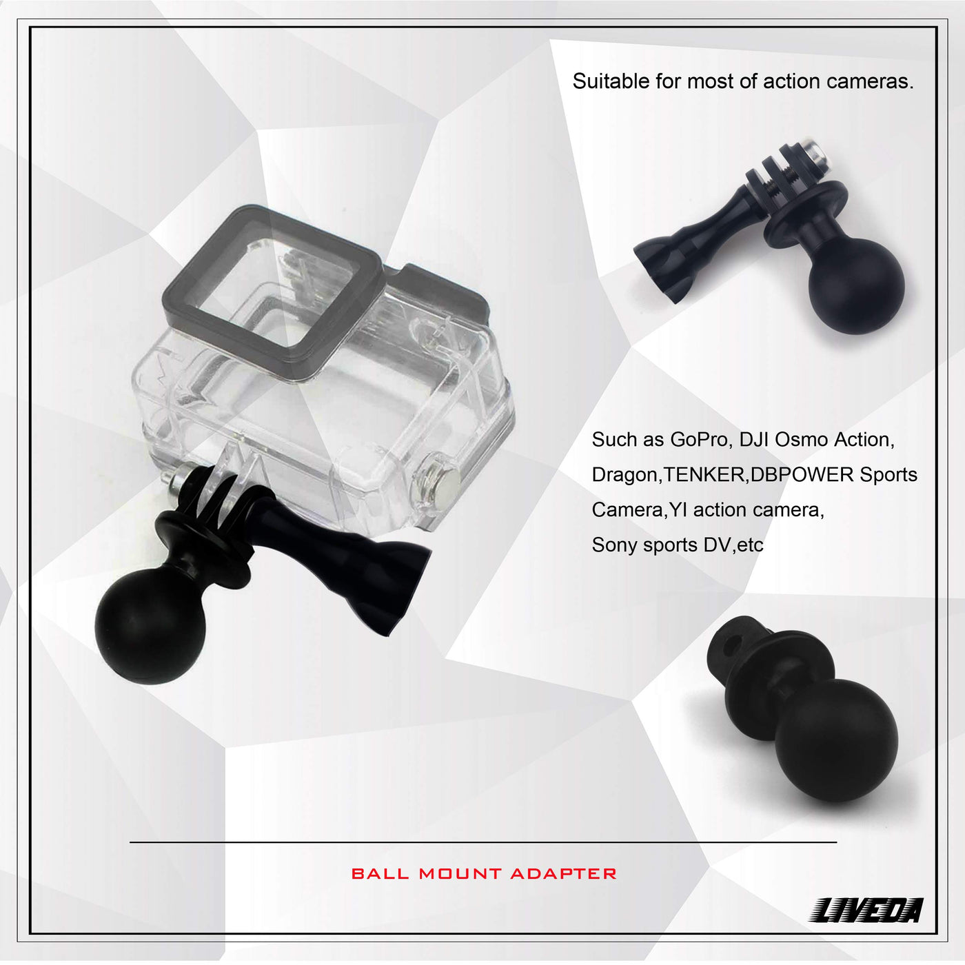 Meet The High-Strength And Multi-Functional Needs Of Outdoor Players, The Adapter Can Combine Various Required Parts. ?Features: 1.Sturdy And Practical. 2.The Adapter Attaches Directly To The Under-Side Of The Camera, Replacing The Mounting Bracket. 3.Multiple Articulation And Adjustment Points For Perfect Viewing Angles. ?Ball Diameter: 1 Inch ?Package Includes: 1X Ball Head Base Adapter 1X Thumb Screw 1X Long Screw ?Note: Camera And Housing Not Included.