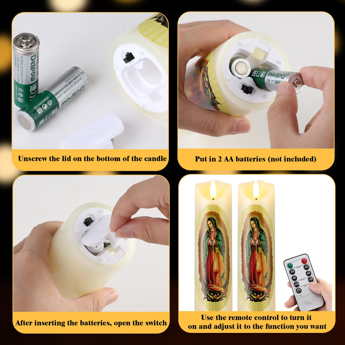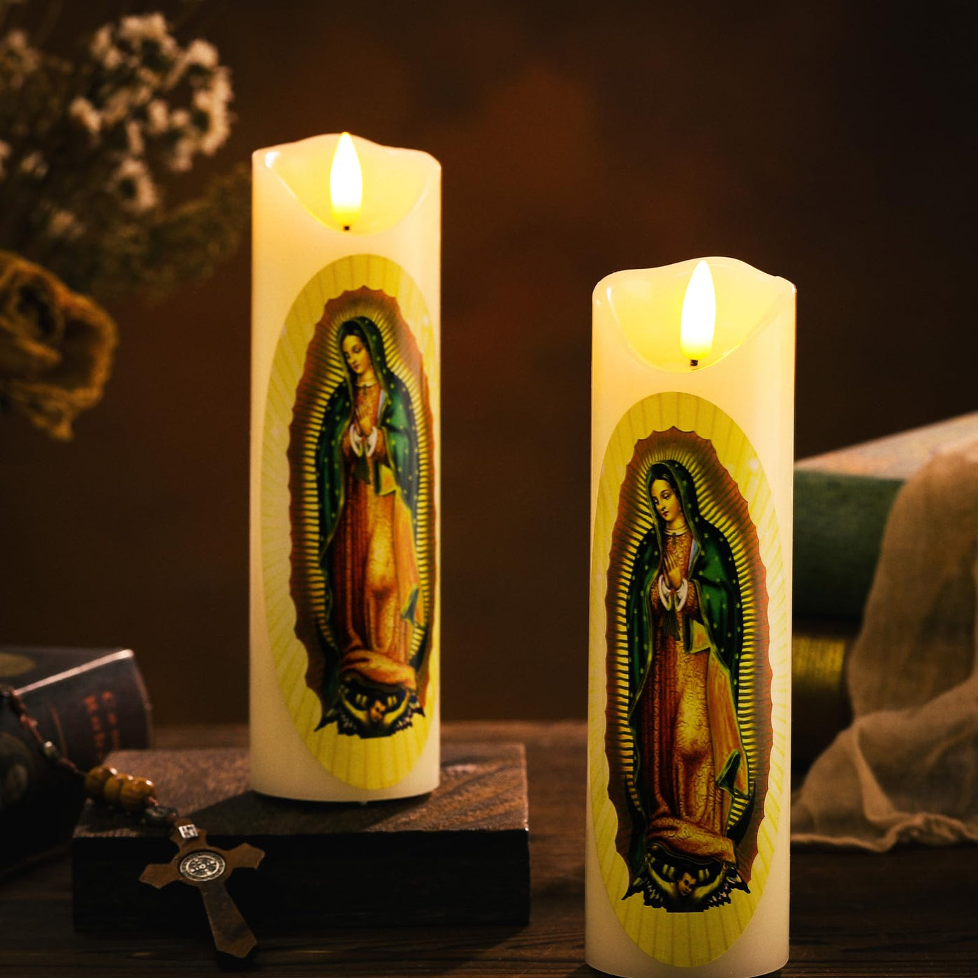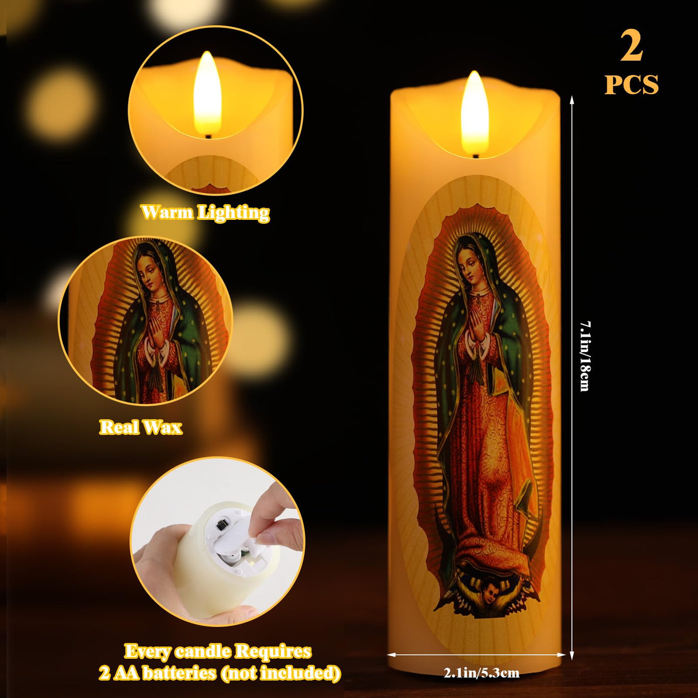 Features: Exquisite Design And Detail: The Carved Candles Feature An Exquisite Design That Captures The Beauty Of Our Lady Of Guadalupe. The Detailed Work On This Candle Is Accurate And Meticulous, Making It A Nice Piece Not Only For Personal Use But Also As A Special Gift To Cherished Ones. Versatile Use: The Blessed Candles Are Versatile For Various Occasions. It Can Be Applied During Church Ceremonies, Prayer Sessions, Religious Commemorations, Or As A Standard Home Decoration. Specifications: Material: Waxcolor: As The Pictures Shownsize: About 2.09 X 6.89 Inches/ 5.3 X 17.5 Cmpackage Includes: 2 X Our Lady Of Guadalupe Candles1 X Remote Controlnotes: Manual Measurement, Please Allow Slight Errors On Size. The Color May Exist A Slight Difference Due To Different Screen Displays.
