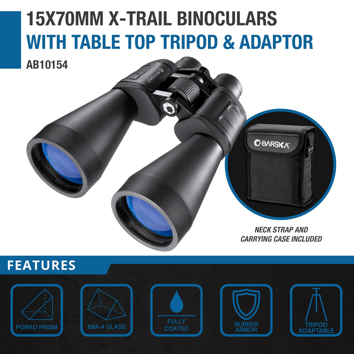 Q: What are the key features of the BARSKA X-Trail 15x70 Binocular?A: The BARSKA X-Trail 15x70 Binocular features a powerful 15x magnification, 70mm objective lens for a bright and clear view, and is designed with a rubber exterior for durability and a comfortable grip. It also includes a tripod adapter and tripod for stable viewing.