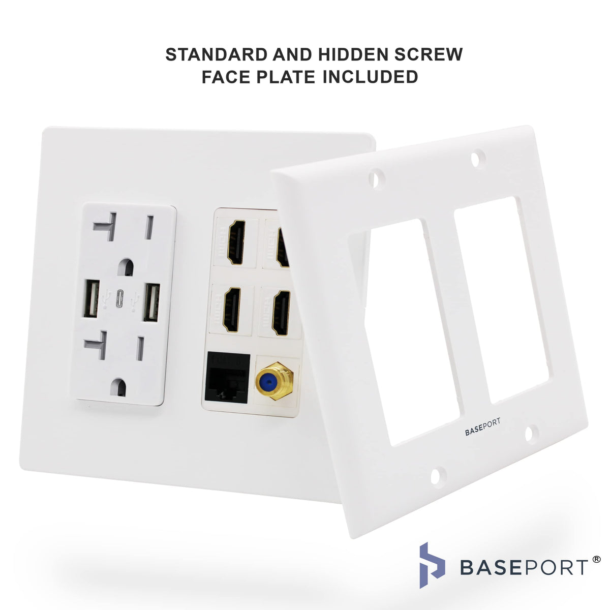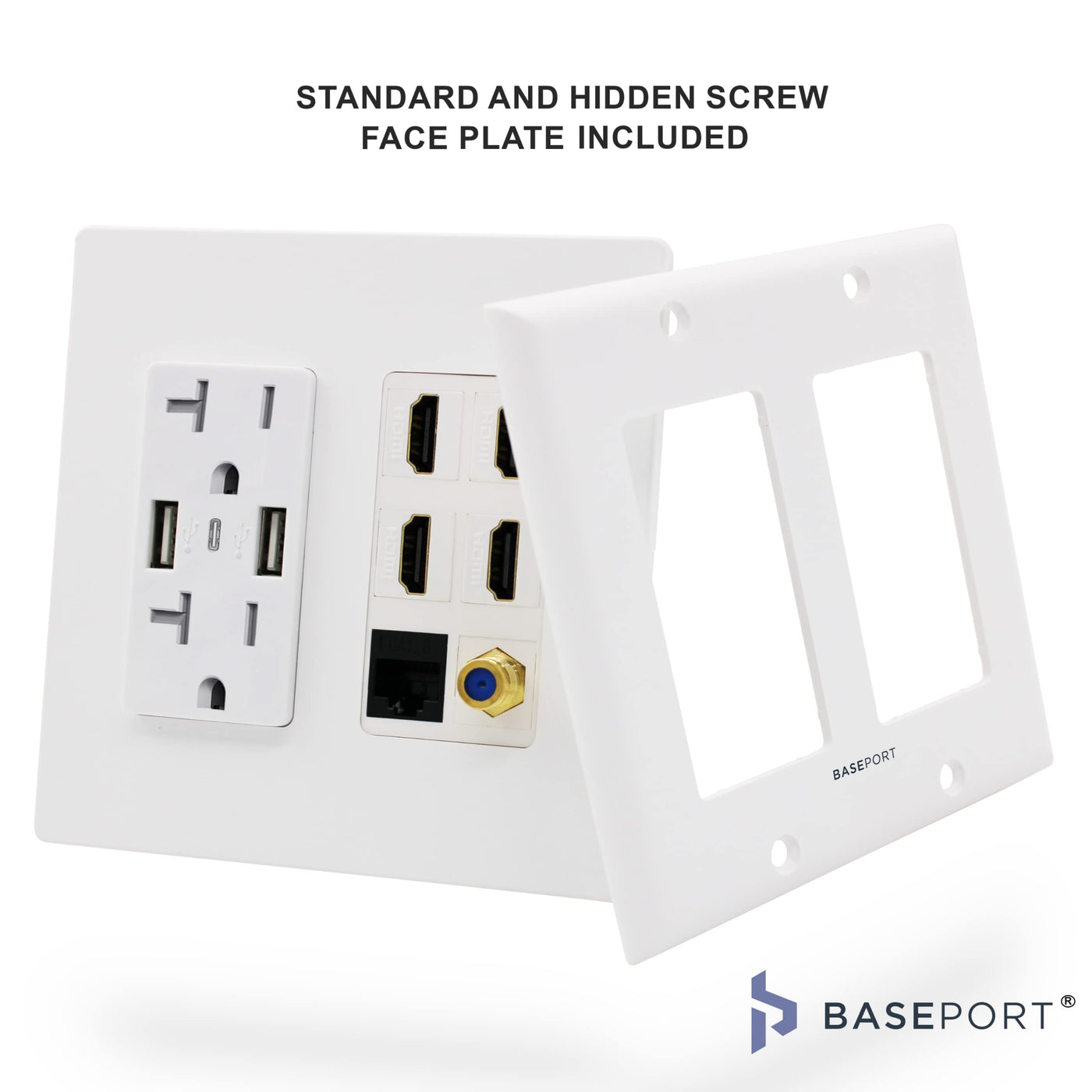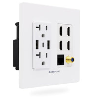 Baseport Premium Media Outlet Wall Plate 6.3A Usb Wall Outlet 2 Usb A 2.0 + 1 Usb C 3.0, 20A Dual Power Outlet, 4 Hdmi Keyston