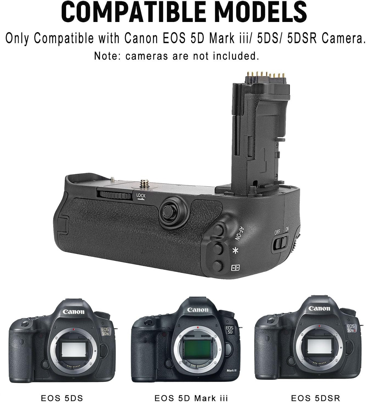 Q: What cameras are compatible with the Battery Grip for Canon EOS 5D Mark III?A: The Battery Grip is specifically designed for use with Canon EOS 5D Mark III, 5DS, and 5DSR cameras, ensuring a perfect fit and seamless integration.