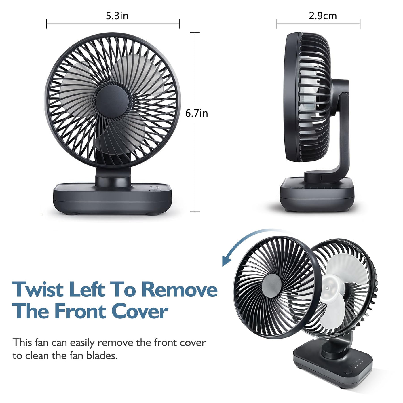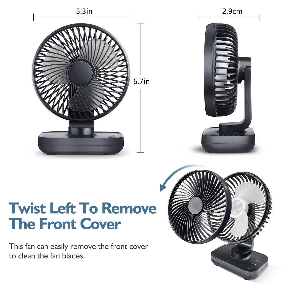 Q: Can I clean the fan blades easily?A: Yes, the fan features a removable front grill. You can simply twist it left to remove the front cover, allowing for easy cleaning of the blades.