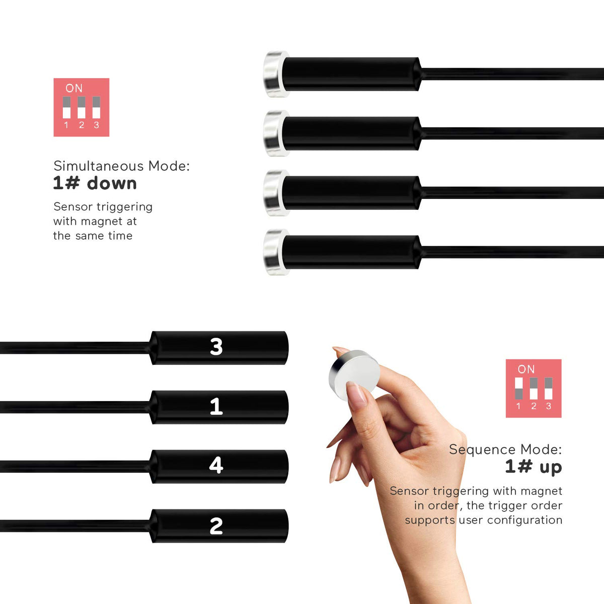 There Is One Controller Connected With 4 Magnet Sensors. We Call It Magnet Sensor Cause It Can Detect Any Object Which Has Strong Magnetic, For Example: Strong Magnet, Magnetic Ring, When Players Put The Strong Magnetic Object In The Right Sequence Or Simultaneous, The Door Will Be Opened. Packing List 1 X Controller (With Speaker) 4 X Magnetic Sensor 5 X Magnets 1 X 12V Power Adapter 1 X Usb Cable 1 X User Manual Note: Props Do Not Include Electromagnetic Locks, Please Provide Your Own. There Are 2 Kinds Of Playing Modes In These Props: Simultaneous Mode And Sequence Mode, It Is Easy To Switch The Playing Modes By The Settings Switch. Simultaneous Mode Step 1: There Are 4 Magnetic Objects. Players Have To Find All The Magnetic Objects First. Step 2: Player Need To Place The 4 Strong Magnetic Objects Close To 4 Magnet Sensors At One Certain Point Of Time, The Props Will Be Triggered And The Door Lock Will Be Opened. Sequence Mode Step 1: There Are Some Magnetic Objects, For Example 4 Magnetic Objects. Players Have To Find All The Magnetic Object First. Step 2: Player Need To Place The Magnetic Object To The Magnetic Sensor In The Correct Order, Then The Props Will Be Triggered And The Door Lock Will Be Opened. How To Reset There Are 3 Ways To Reset The Props. Automatically Reset Mode: Waiting For 1 Minute To Automatically Reset After Successful Trigger (There Will Be A Buzzing Sound When It Reset). Real Time Reset Mode Sequence Mode - After Triggering Successfully, Put The Magnetic Object To The Magnetic Sensor In The Correct Order Again To Reset. Simultaneous Mode - Take Away All The Magnetic Objects From The Magnetic Sensor To Reset. Manual Reset: Restart The Controller To Reset.