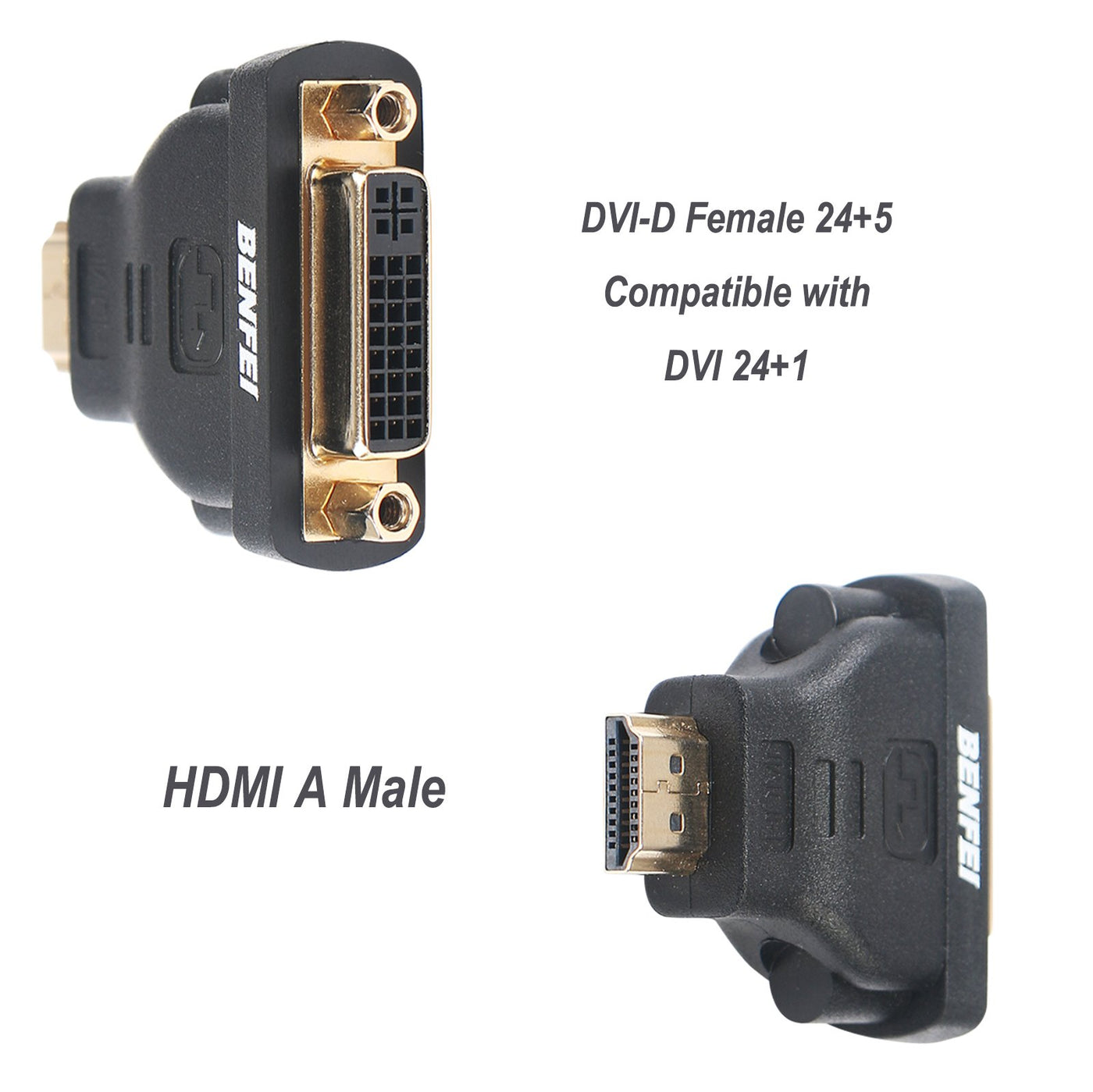 Q: What devices are compatible with the BENFEI HDMI to DVI Adapter?A: The BENFEI HDMI to DVI Adapter is compatible with devices that have an HDMI port, such as computers, Blu-ray players, TV boxes, and game consoles. It can connect to monitors, HDTVs, or projectors that have a DVI port.